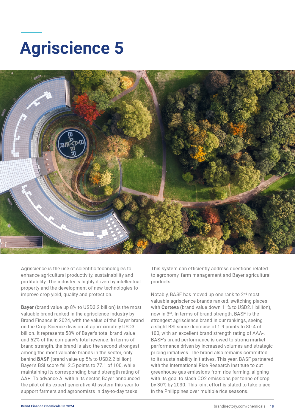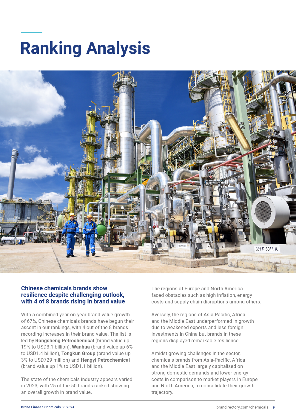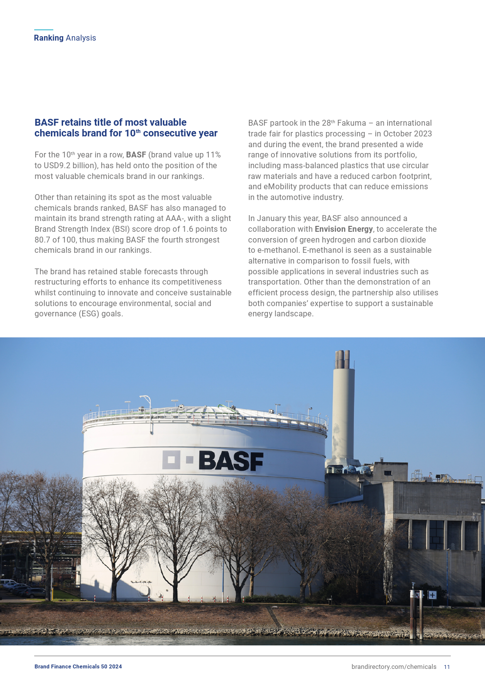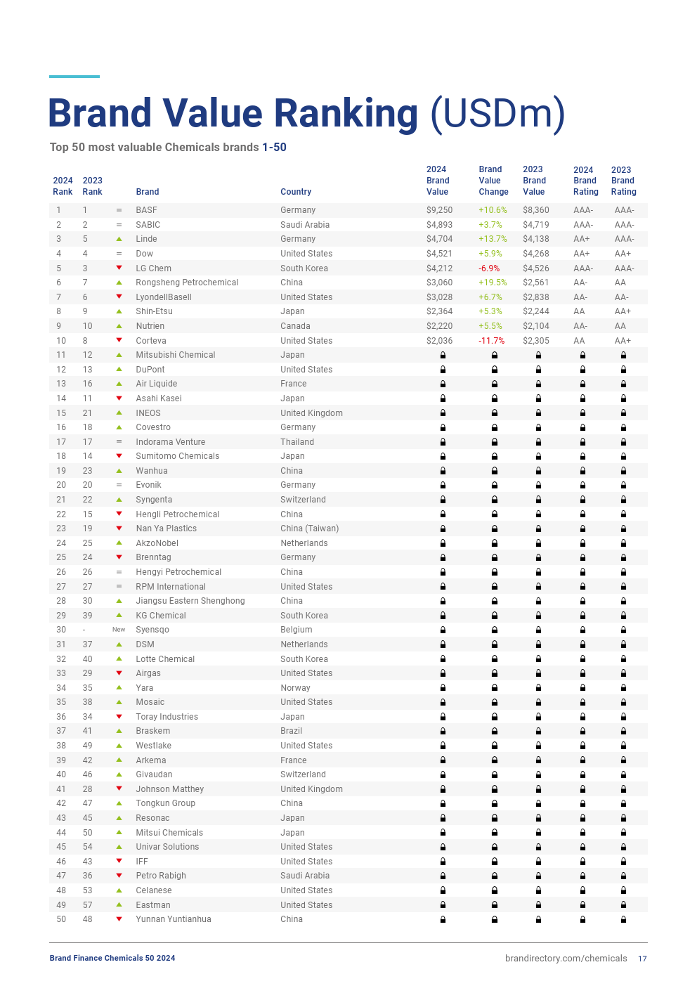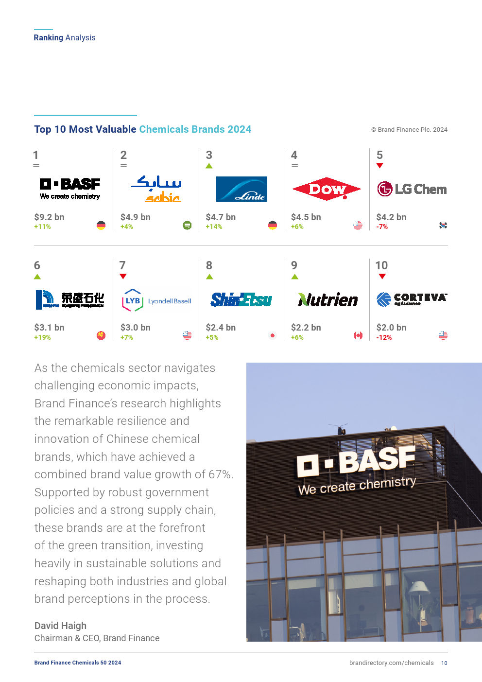 Brand Finance发布了“2024年化学品牌50强”,巴斯夫连续10年蝉联最具价值化学品牌。