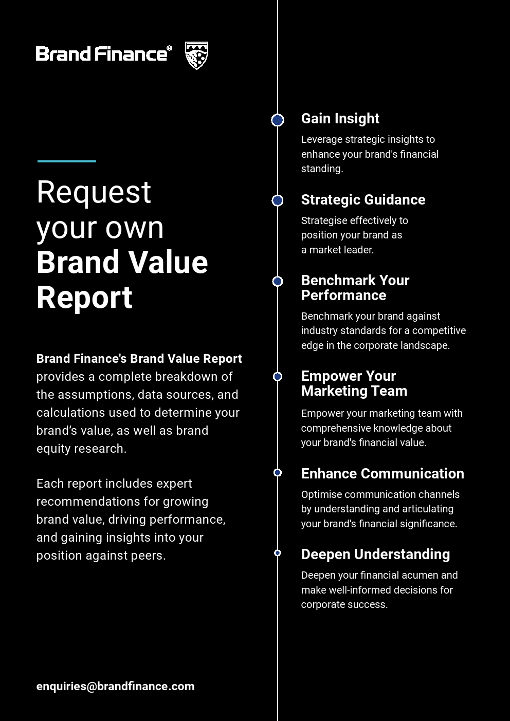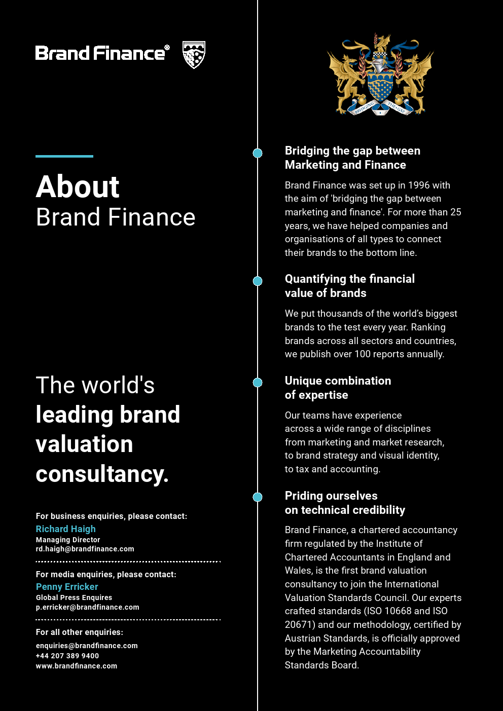 除了计算品牌价值外,Brand Finance还通过平衡计分卡来评估营销投资、利益相关者权益和业务绩效,从而确定品牌的相对实力。Brand Finance对利益相关者权益的评估符合ISO 20671标准,纳入了来自38个国家31个行业的10万多名受访者的原始市场研究数据。