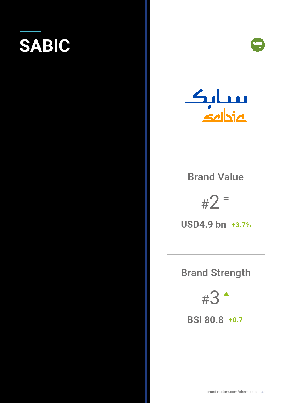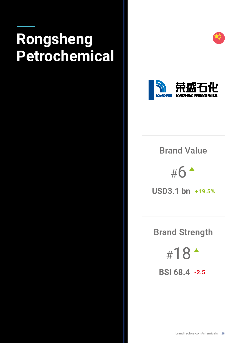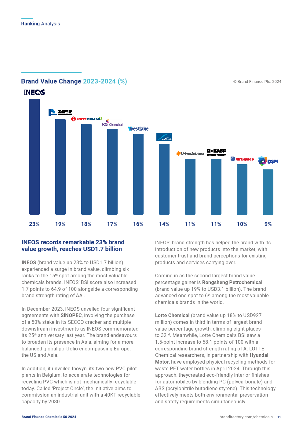 英力士(品牌价值增长23%,达到17亿美元)的品牌价值大幅增长,在最有价值化学品品牌中排名上升6位,名列第15位。英力士的BSI得分也增加了1.7分,达到64.9分(满分100分),相应的品牌实力评级为AA-。