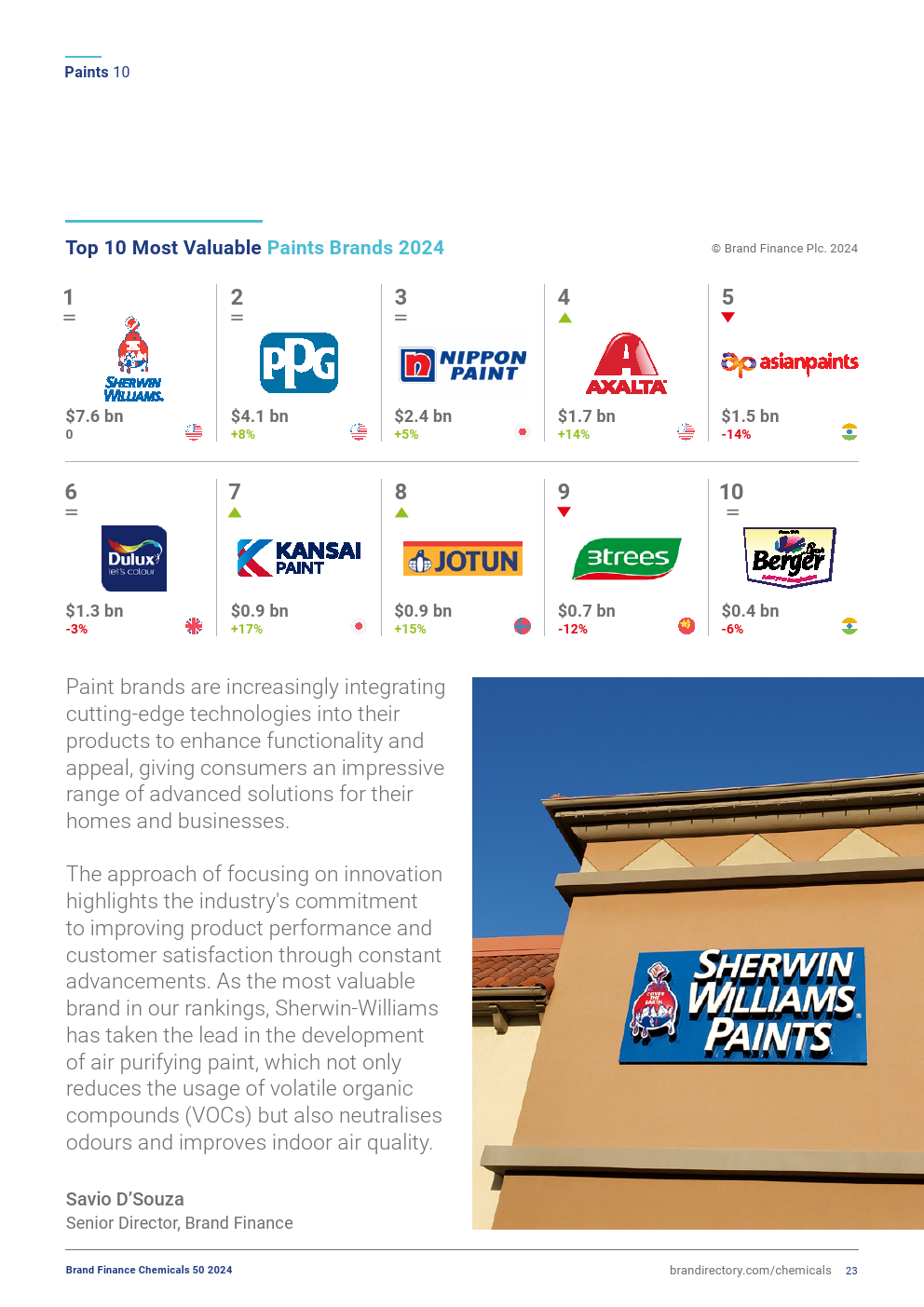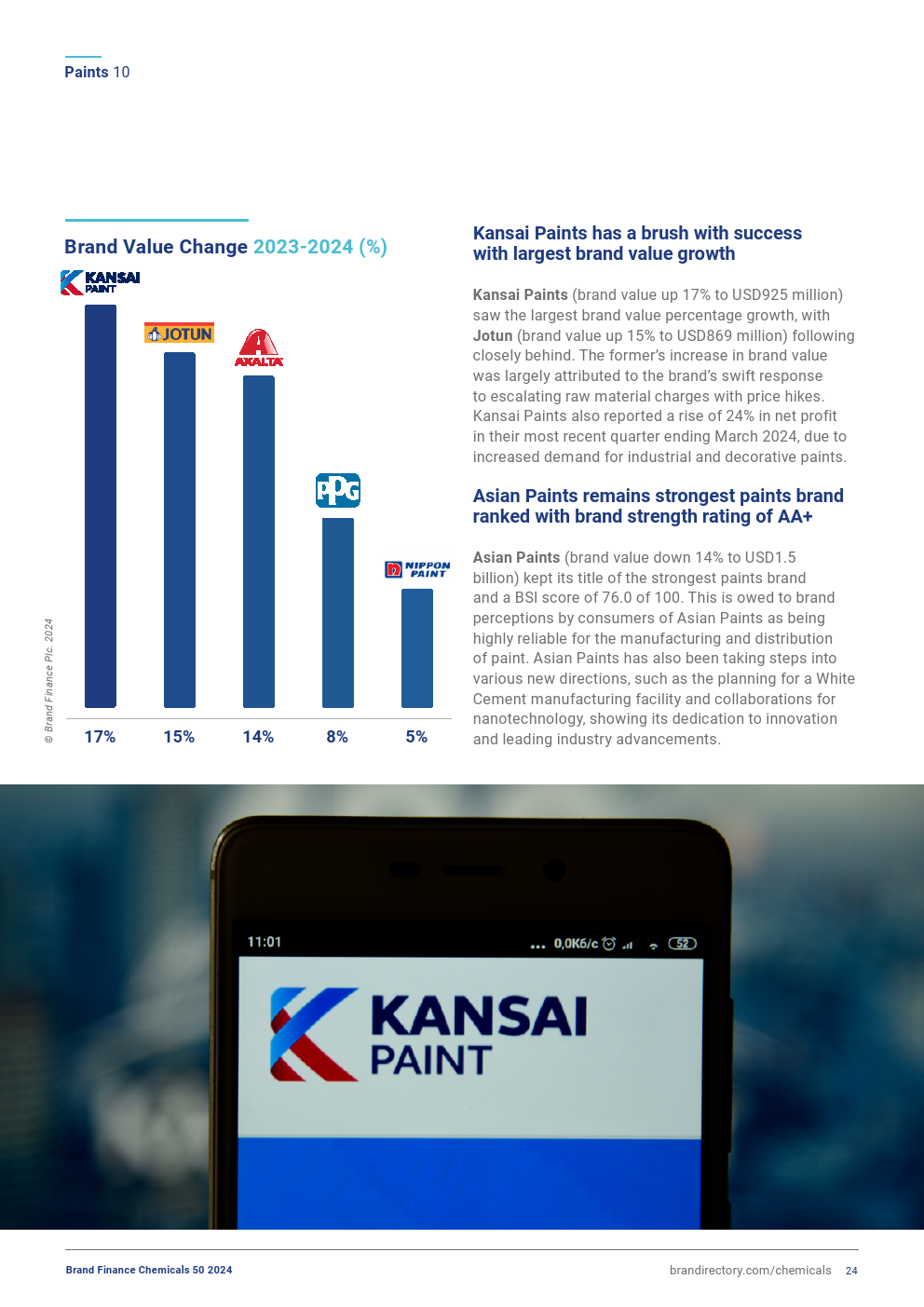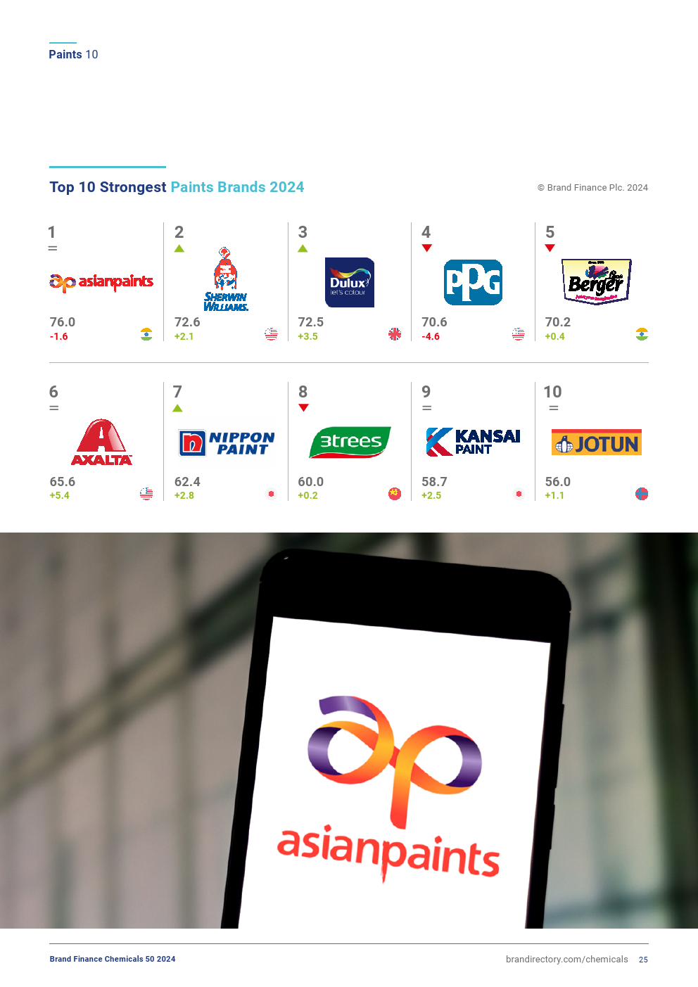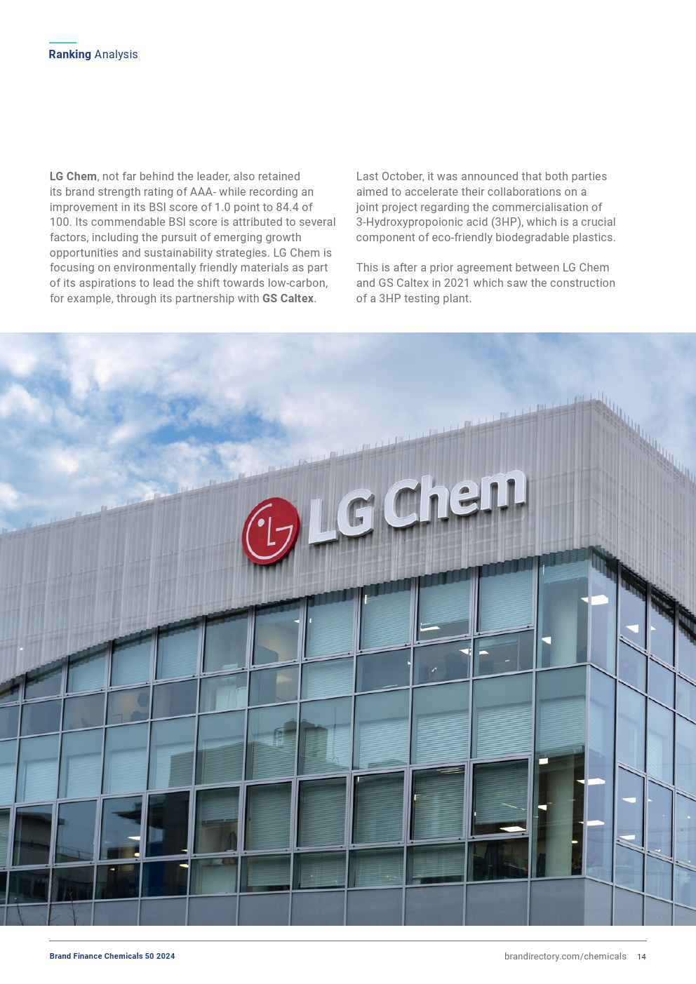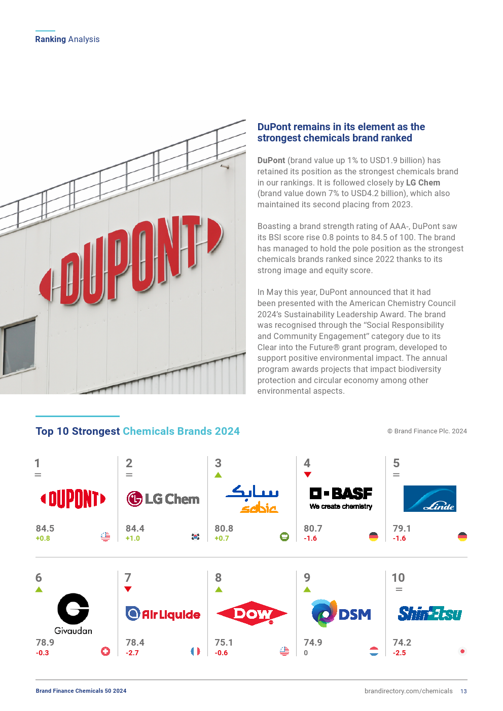 杜邦(品牌价值增长1%至19亿美元)在排名中保持了其最强化学品品牌的地位。紧随其后的是LG化学(品牌价值下降7%,至42亿美元),自2023年以来也保持了第二的位置。