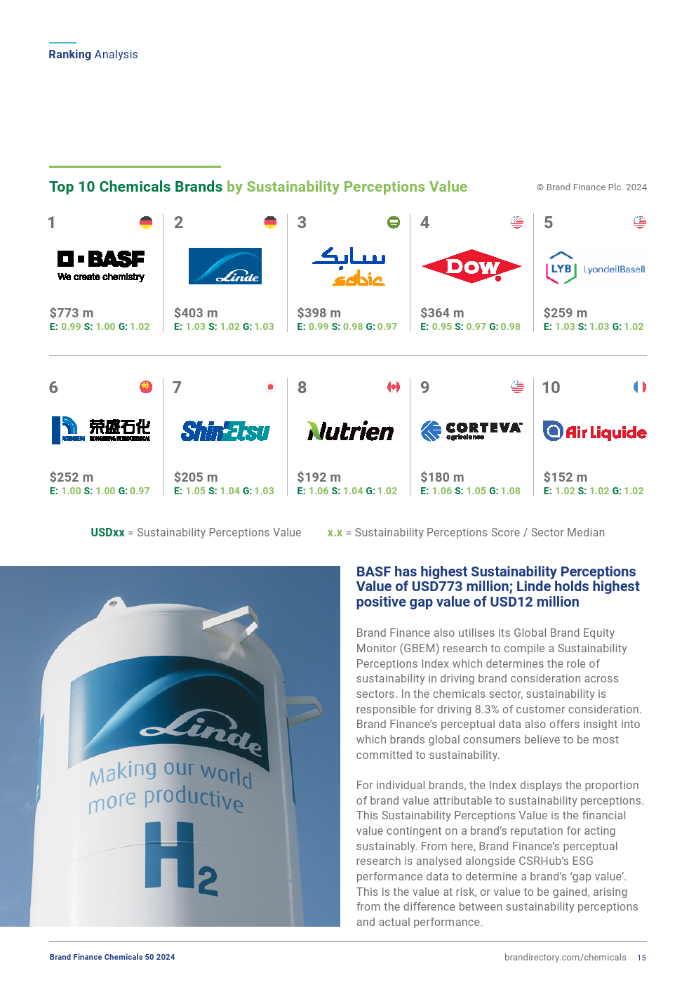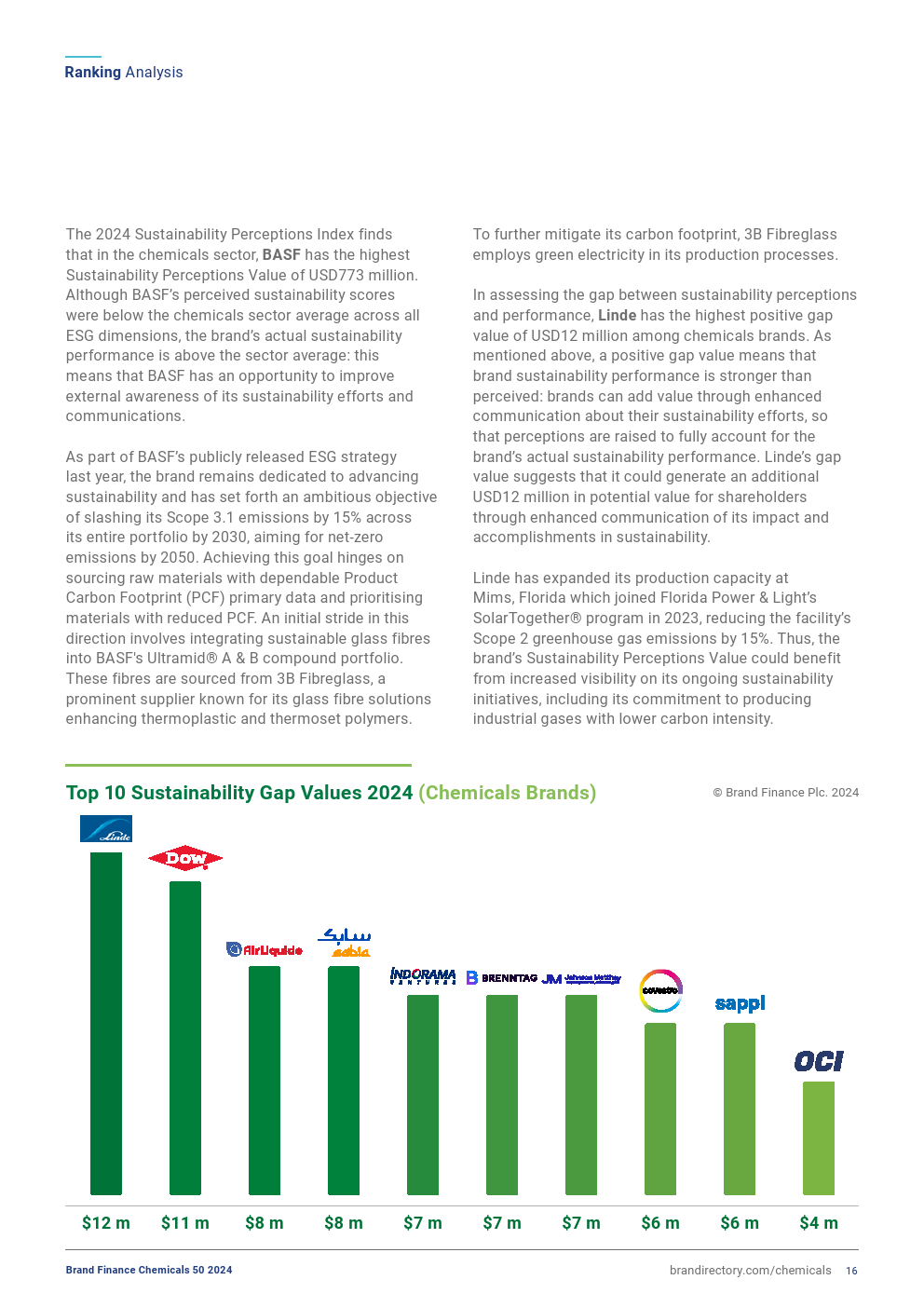 巴斯夫可持续发展感知价值最高,达7.73亿美元;林德拥有最高的正差距价值,为1200万美元