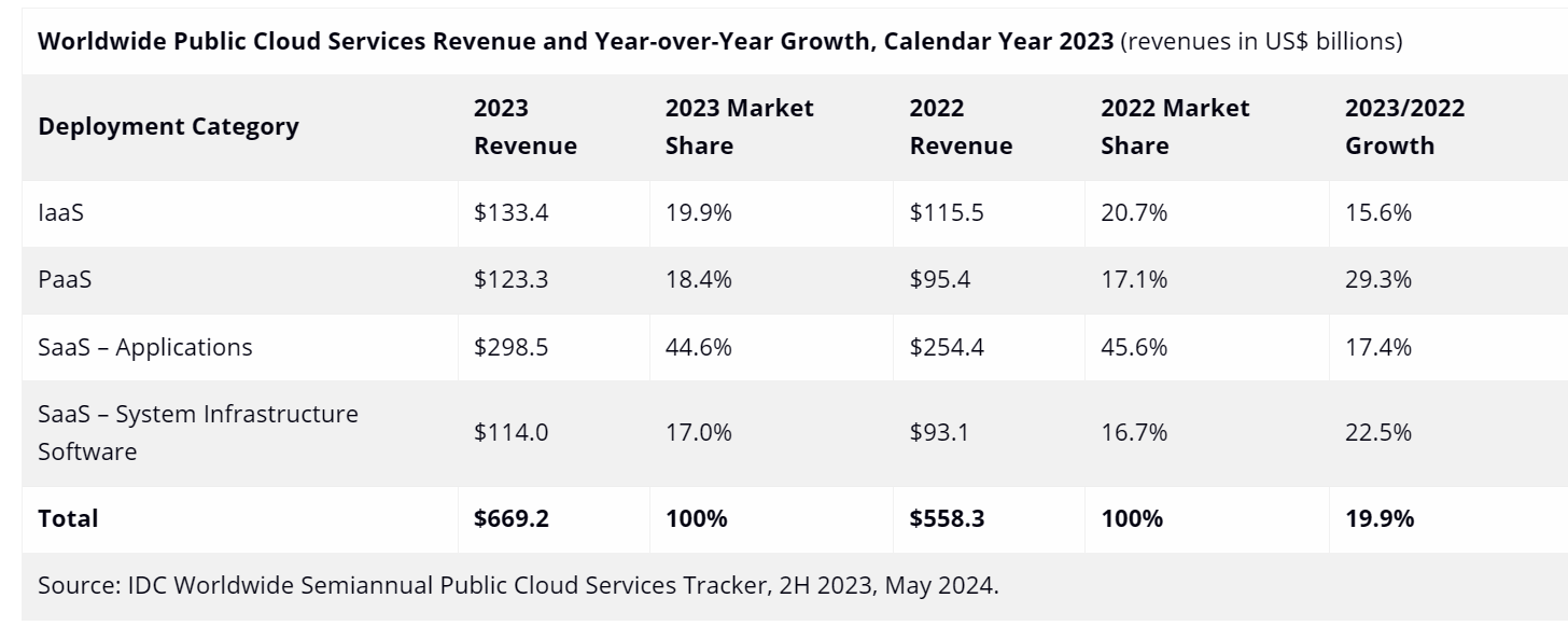2023年公共云服务收入的最大来源是软件即服务-应用程序(SaaS -应用程序),占市场总额的近45%。基础设施即服务(IaaS)是第二大收入类别,占总收入的19.9%;平台即服务(PaaS)和软件即服务-系统基础设施软件(SaaS – SIS)分别占总收入的18.4%和17.0%。PaaS和SaaS – SIS是收入同比增长最快的分支。