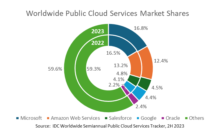 领先的公共云服务提供商在2023年保持了领先地位,前五大公共云服务提供商(微软、亚马逊网络服务、Salesforce Inc.、谷歌和甲骨文)占全球总收入的40.5%。凭借其部署的产品,微软在2023年整个公共云服务市场中仍保持领先地位,市场份额为16.8%;其次是亚马逊网络服务,市场份额为12.4%。