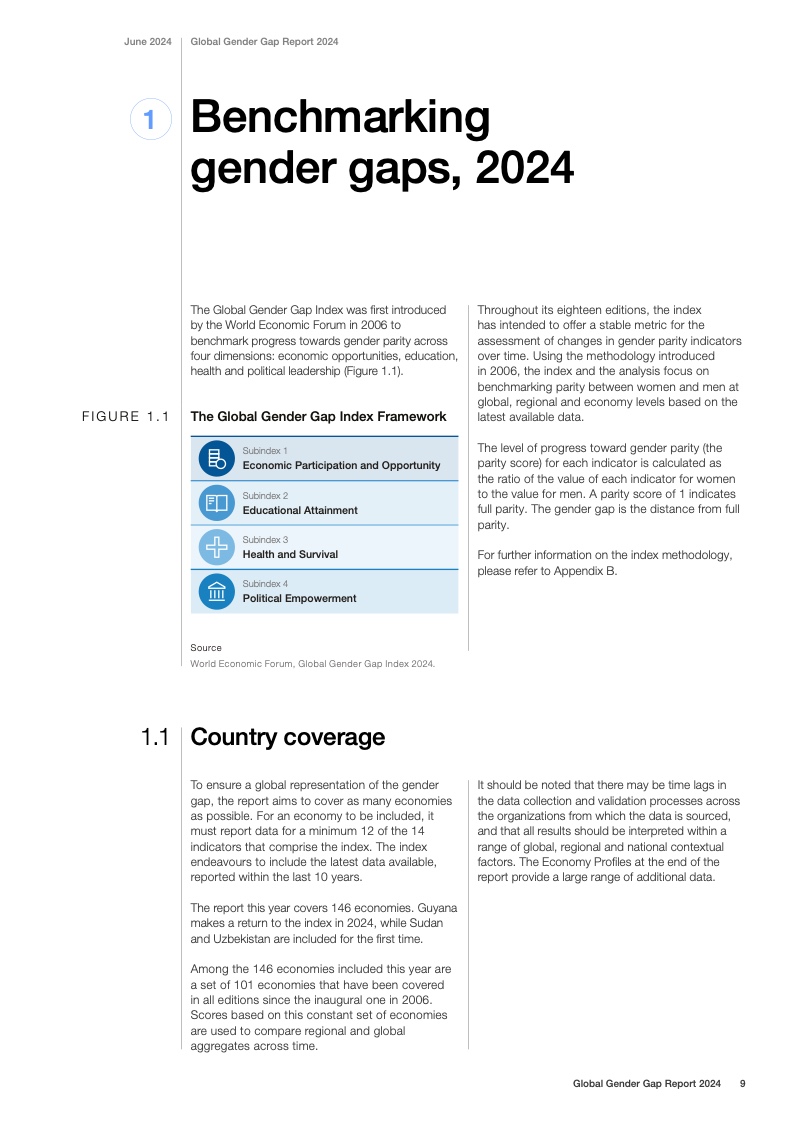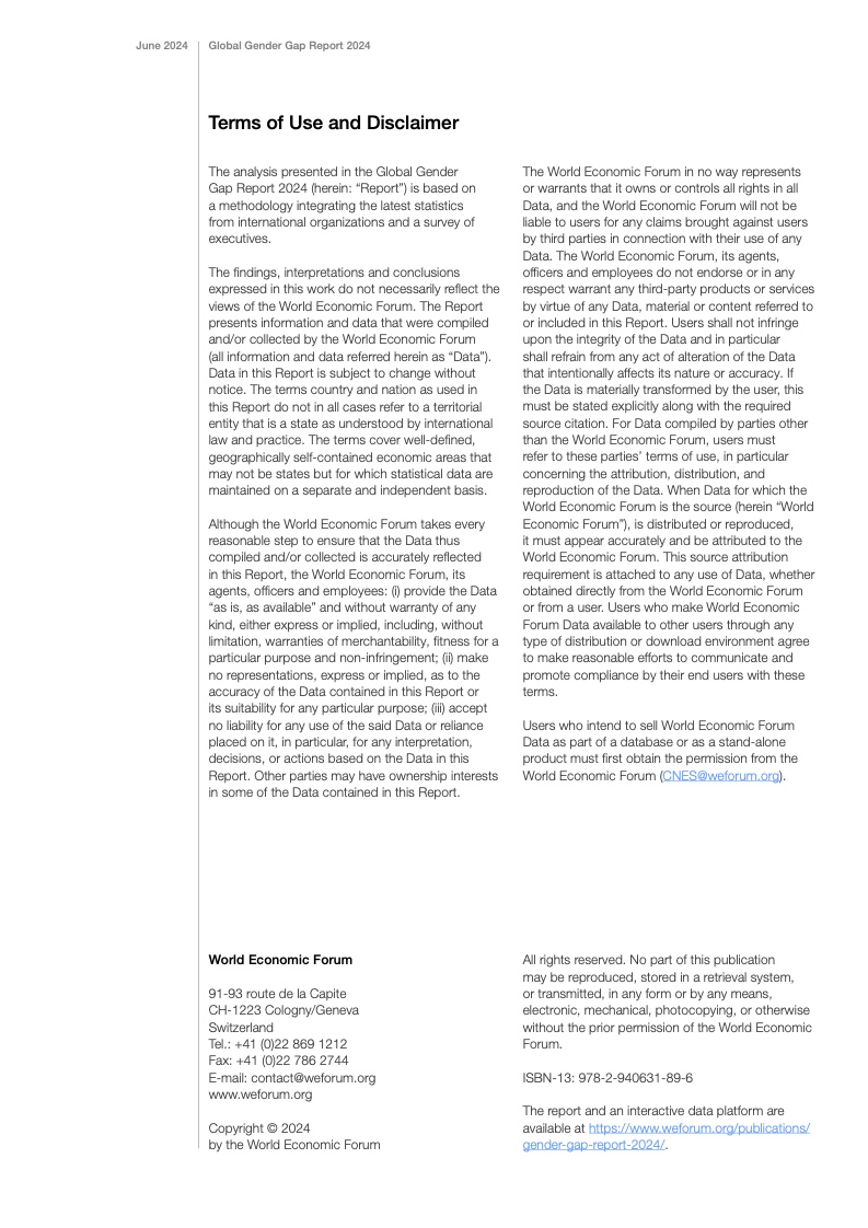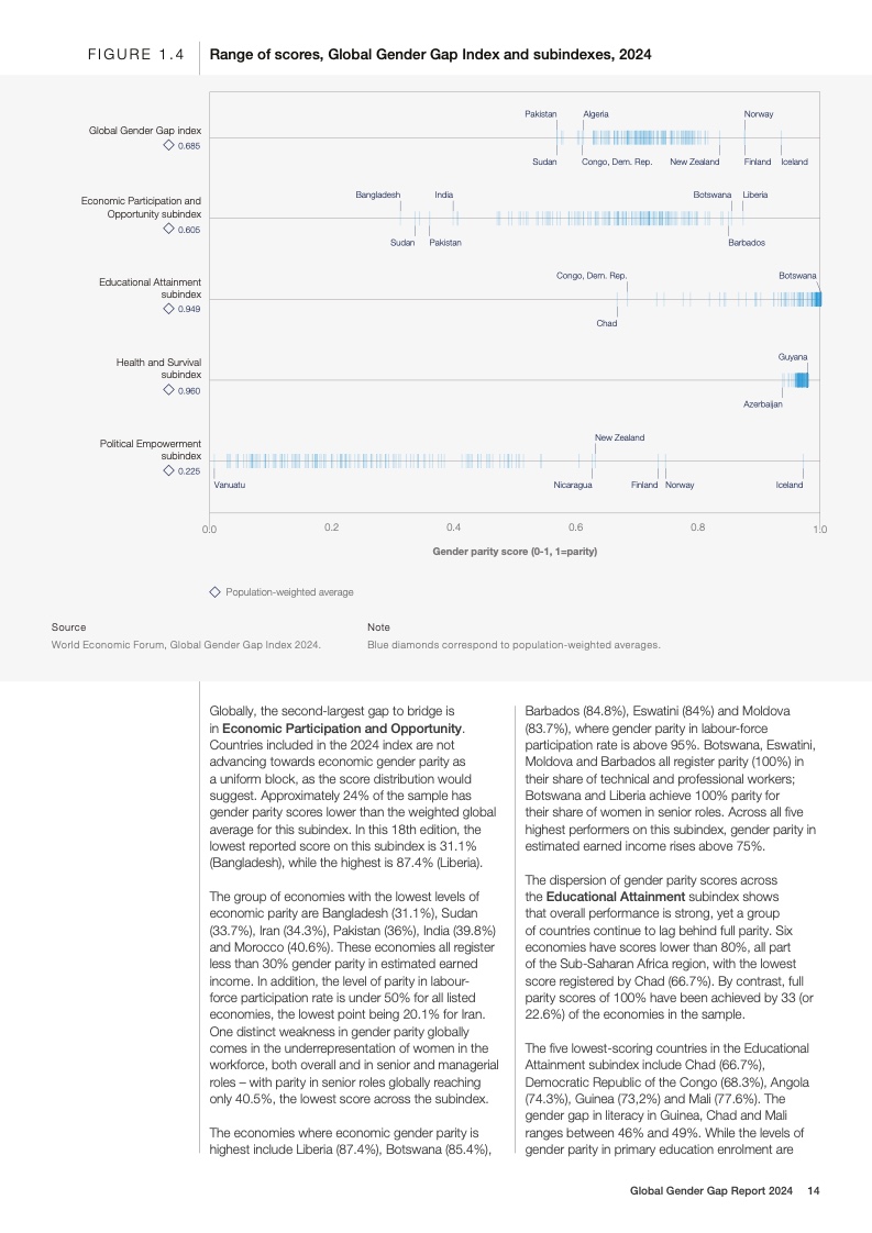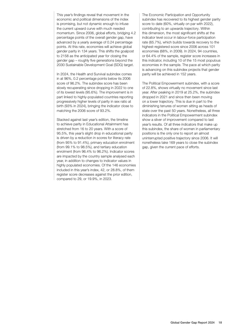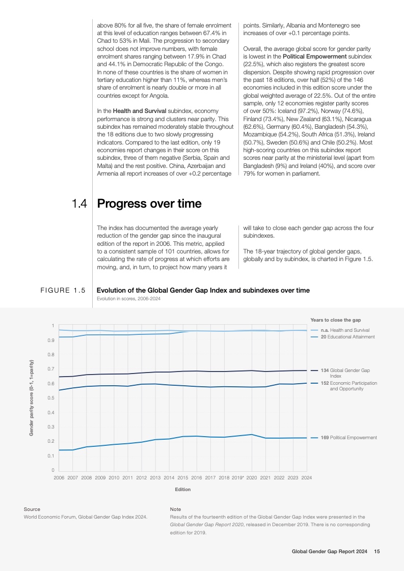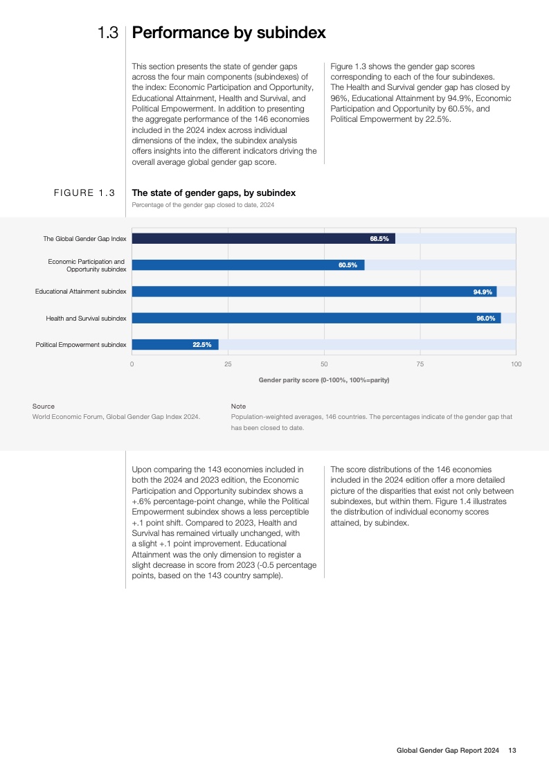 在全球性别差距指数覆盖的经济体中,有半数逐渐取得了进步,但性别差距仍然巨大。2024年,全球性别差距略有缩小,这要归功于“经济参与和机会”指标的改善(提高了0.6个百分点),但与此同时,“政治赋权”与“健康和生存”指标进步缓慢,而“教育程度”指标甚至出现了小幅退步。