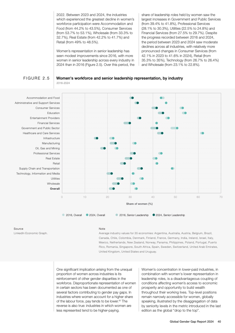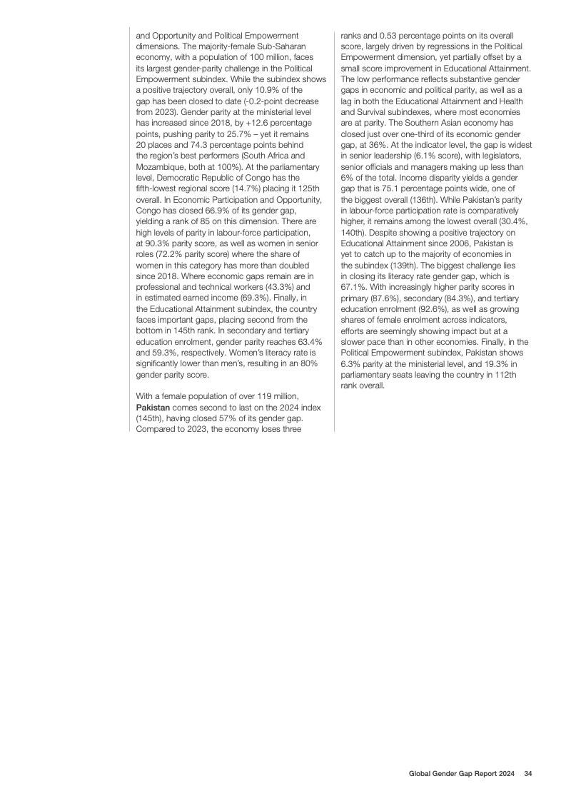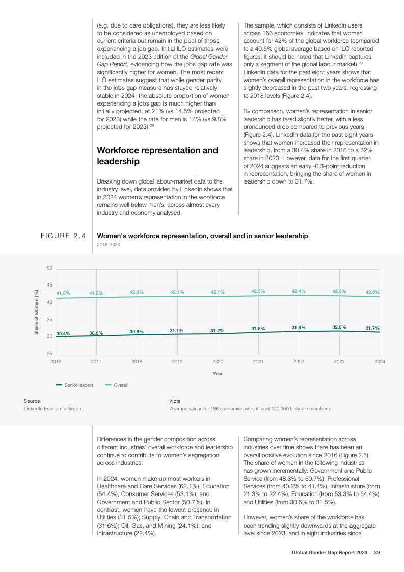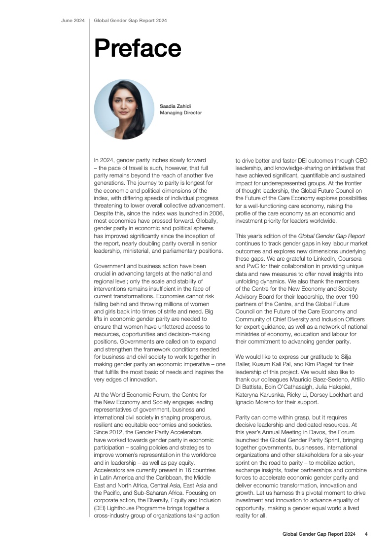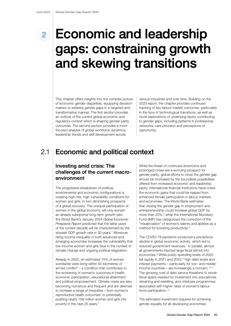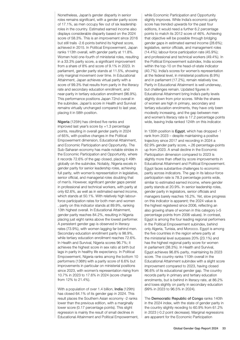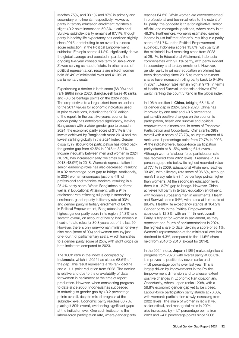 在全球性别差距指数覆盖的经济体中,有半数逐渐取得了进步,但性别差距仍然巨大。2024年,全球性别差距略有缩小,这要归功于“经济参与和机会”指标的改善(提高了0.6个百分点),但与此同时,“政治赋权”与“健康和生存”指标进步缓慢,而“教育程度”指标甚至出现了小幅退步。