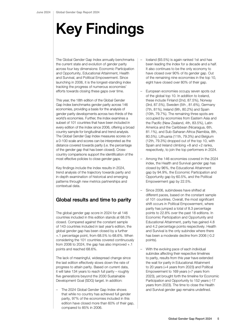 全球性别差距已经消除了68.5%,但按照目前的进步速度,还需要134年,即五代人的时间,才能完全实现性别平等。和上一年度相比,全球性别差距缩减了0.1个百分点。
