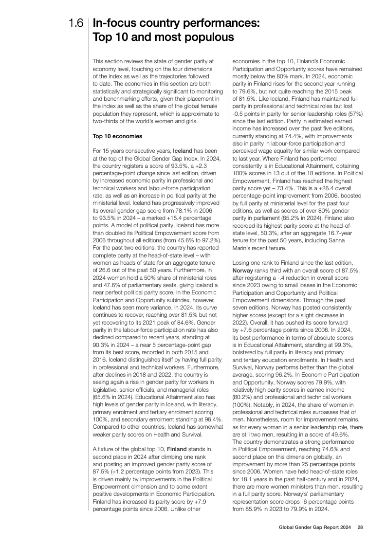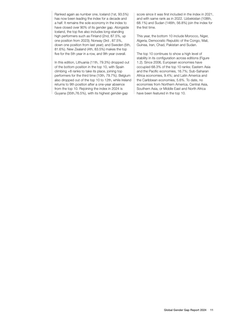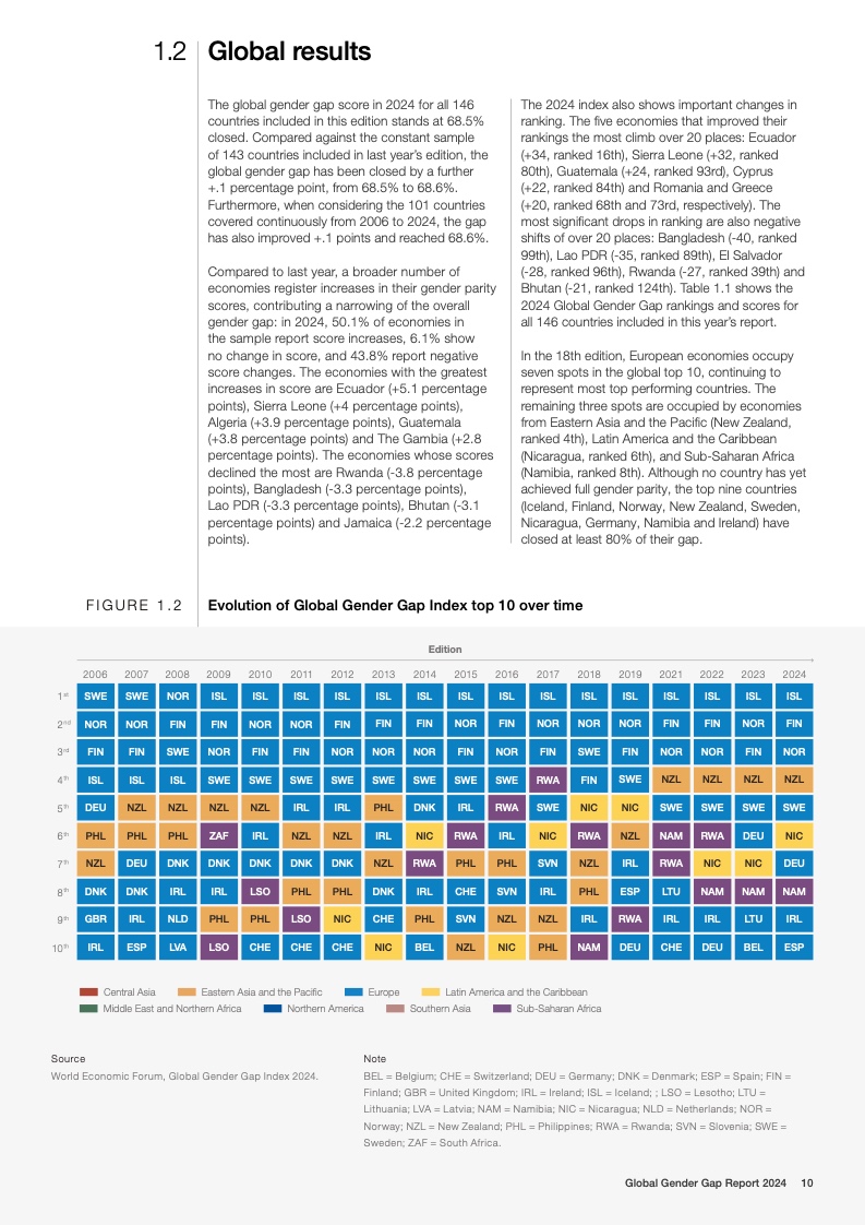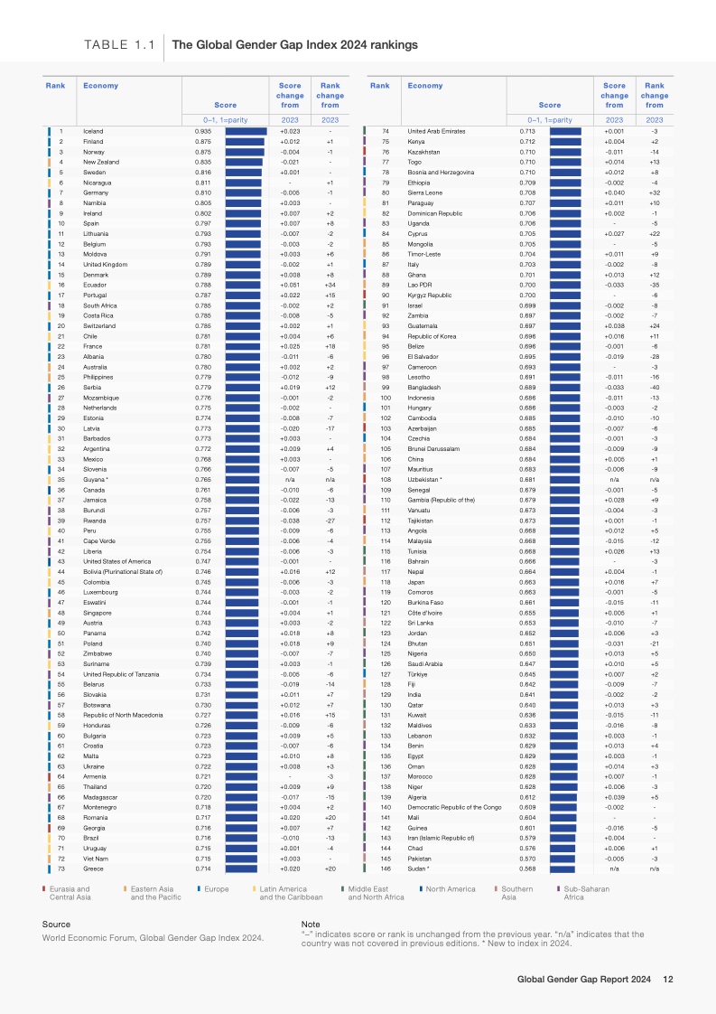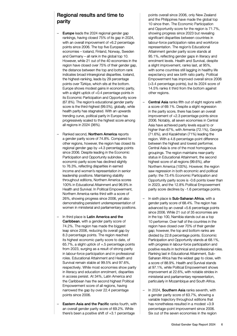 欧洲继续引领榜单,性别平等得分达到75%。排名前十的国家中有7个来自欧洲。冰岛仍然是世界上性别最为平等的国家,总体上已经消除了93.5%的性别差距。其他排名靠前的国家包括芬兰、挪威、瑞典、德国和爱尔兰,这些国家均消除了80%以上的性别差距。自2006年以来,欧洲在性别平等方面的总体得分提高了6.2个百分点。