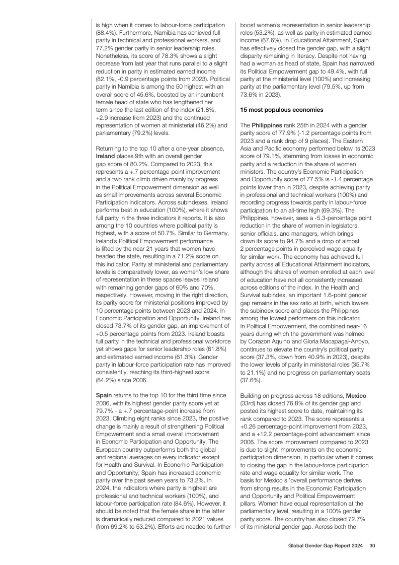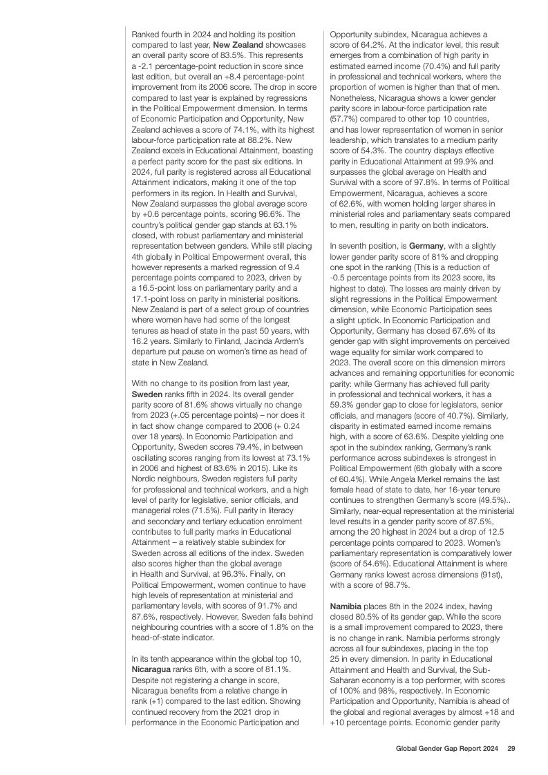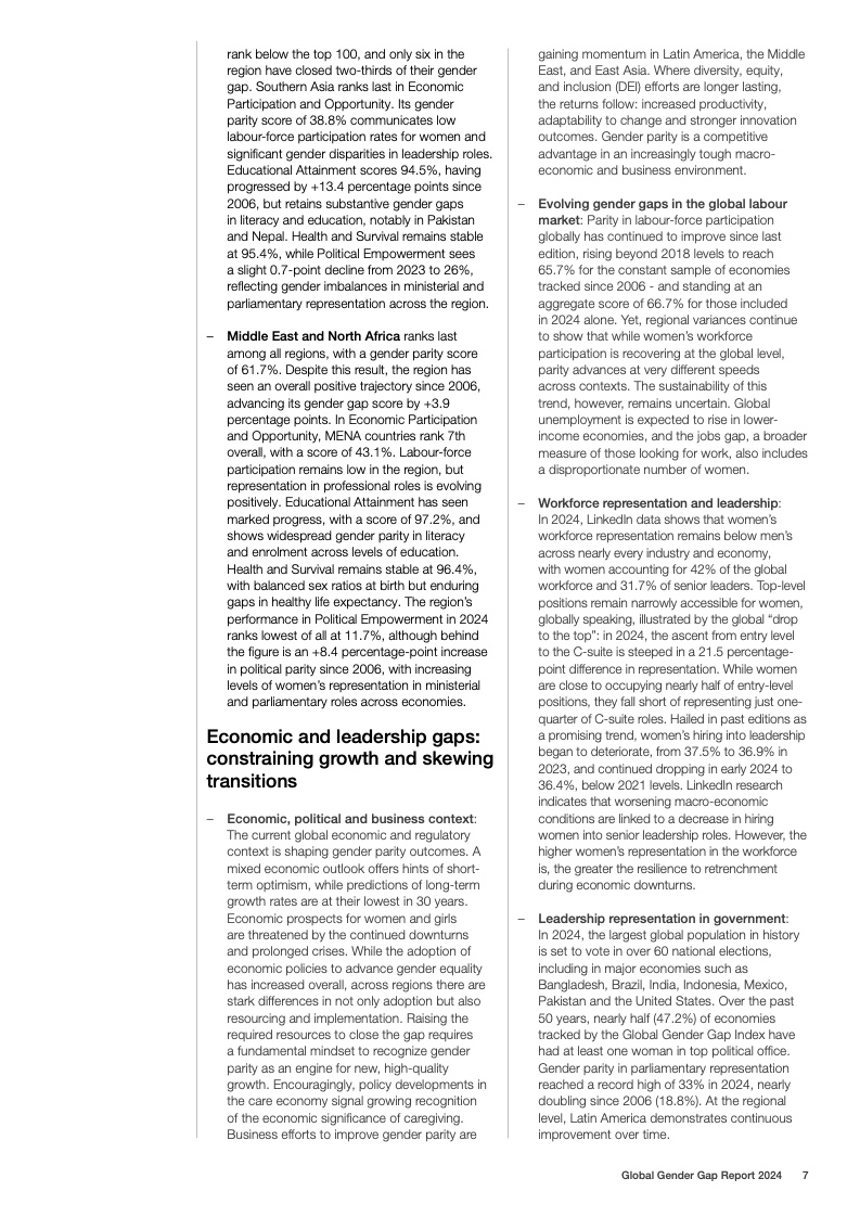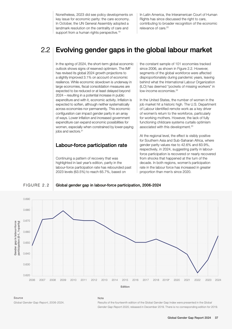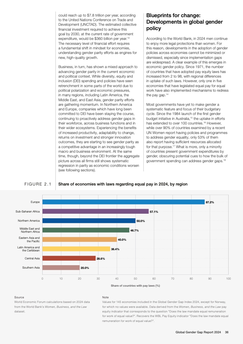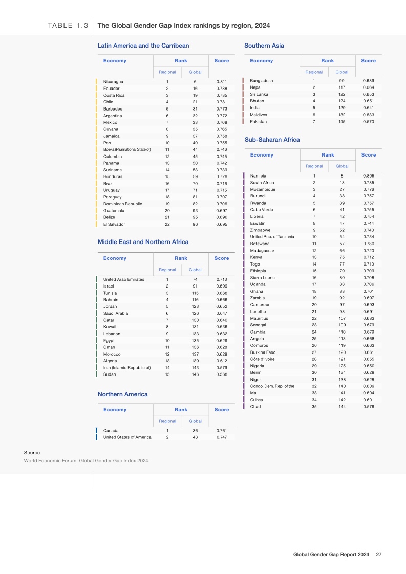 挑战虽然根深蒂固,但报告还是发现了一些显著而积极的态势。全球劳动力参与率的性别平等状况从疫情结束后的低位(62.3%)反弹至65.7%。拉丁美洲和加勒比地区的性别平等总体得分为74.2%。在劳动力参与和专业职位平等状况的强力拉动下,该区域在经济领域的平等状况得分达到创纪录的65.7%,在政治赋权方面的得分也攀升至历史第二高(34%)。拉丁美洲的成功案例能为其他地区树立榜样。