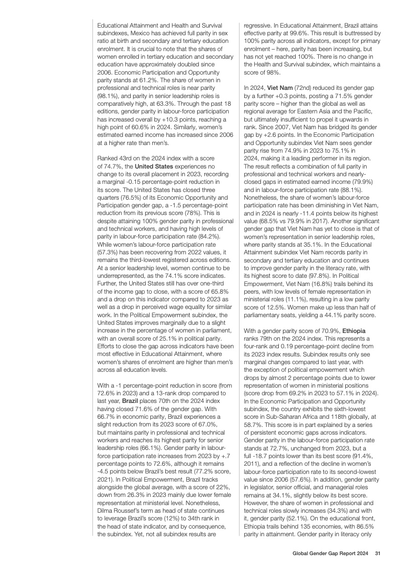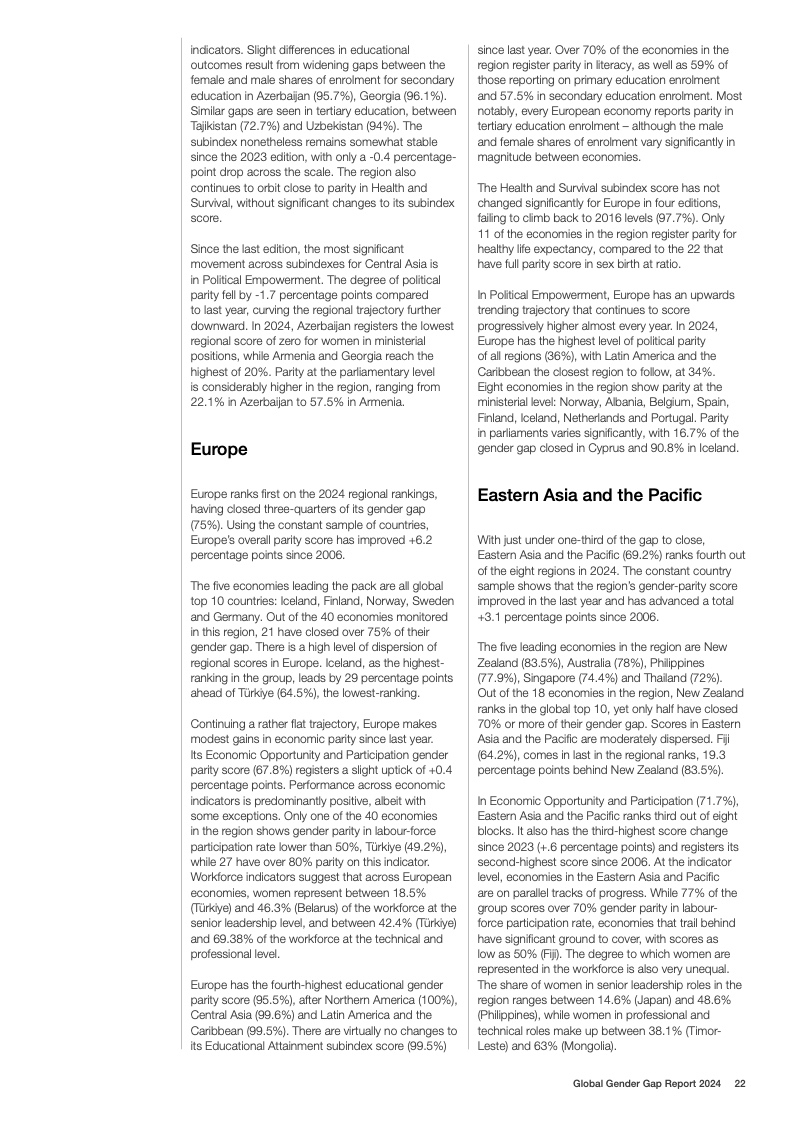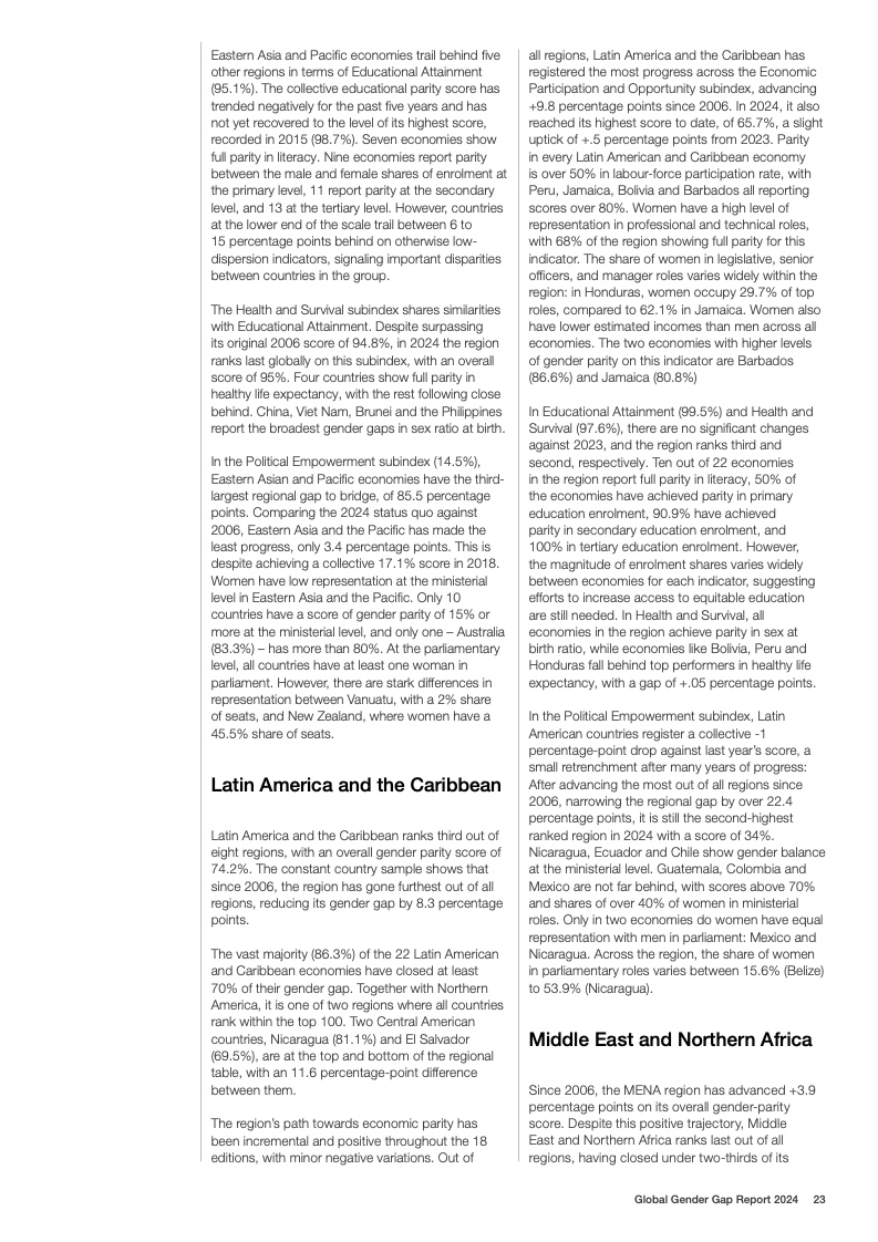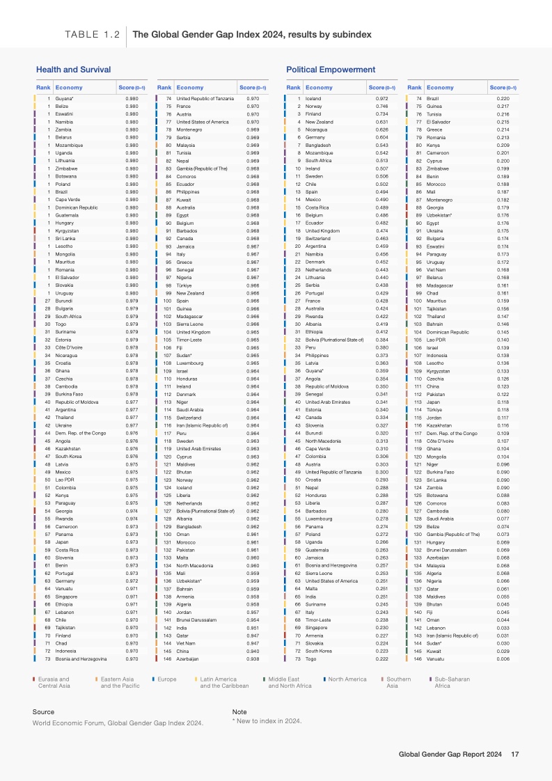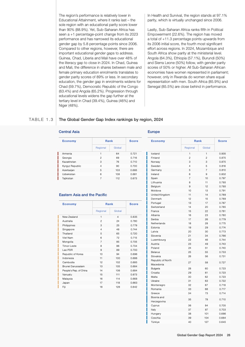 东亚和太平洋地区的性别平等得分为69.2%,在各区域中排名第四。该地区在经济参与和机会方面的得分提高至71.7%,但区域内不同国家在劳动力参与和劳动力比例方面存在巨大差距。该地区在教育和健康领域表现强劲,但在政治赋权方面处于下风。排名靠前的国家包括新西兰(第4位)和菲律宾(第25位)等。
