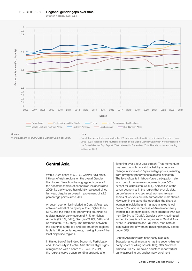 中亚以69.1%的得分位列第五。该地区在教育程度和健康等指标上几乎实现了性别平等,但在经济和政治领域的得分相较2023年却退步了。亚美尼亚、格鲁吉亚和哈萨克斯坦是该地区表现最好的国家,均消除了71%以上的性别差距。