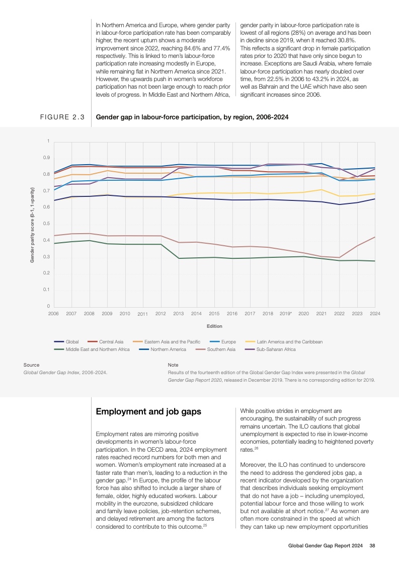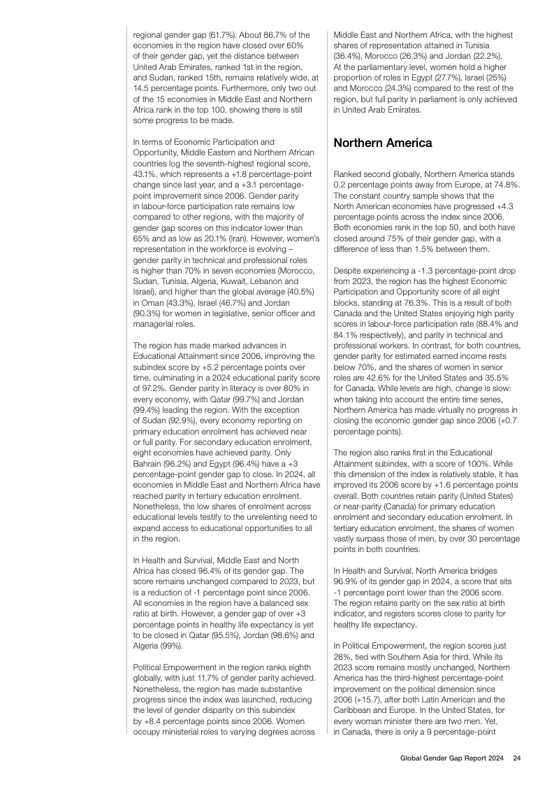 拉丁美洲和加勒比地区排名第三,性别平等得分74.2%。自2006年以来,该地区取得了巨大进步,总体得分提高了8.3个百分点,成为进步最明显的地区。北美在劳动力参与方面也取得了令人鼓舞的进步,专业和技术职位的女性比例达到了很高的水平,区域总体得分达到了68%。