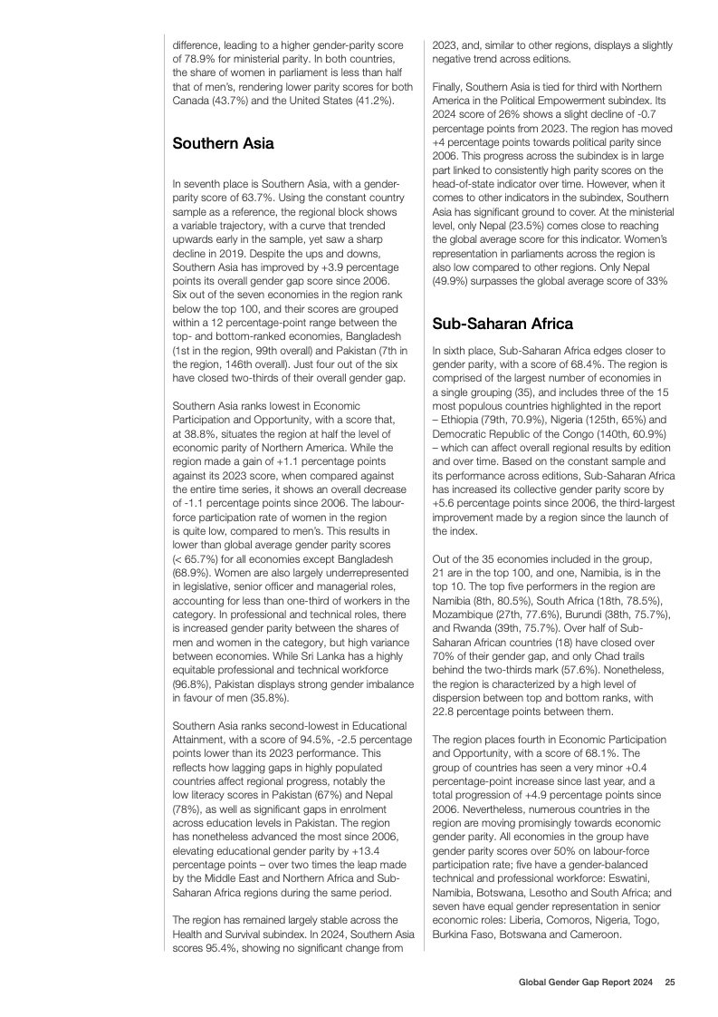 撒哈拉以南非洲位列第六,得分68.4%。该地区在政治赋权方面取得了长足的进步,纳米比亚和南非等国家更是一马当先。但是,在经济参与和教育程度方面,该地区仍然面临重重挑战。半数以上的国家消除了70%以上的性别差距,但排名最高和最低国家的分差高达22.9个百分点。