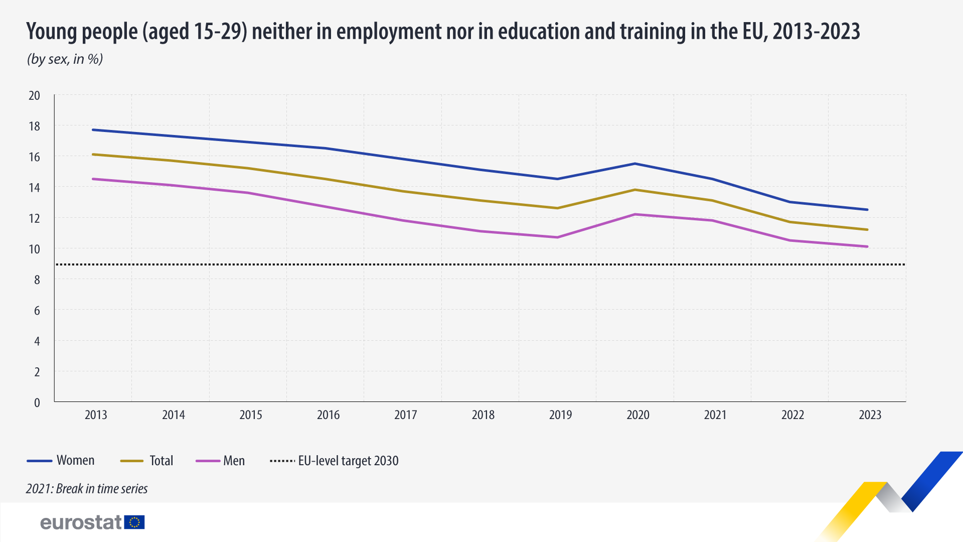 降低这一比率是欧洲社会权利支柱的目标之一。目标是到2030年将15-29岁年轻人的啃老族比率降至9%。