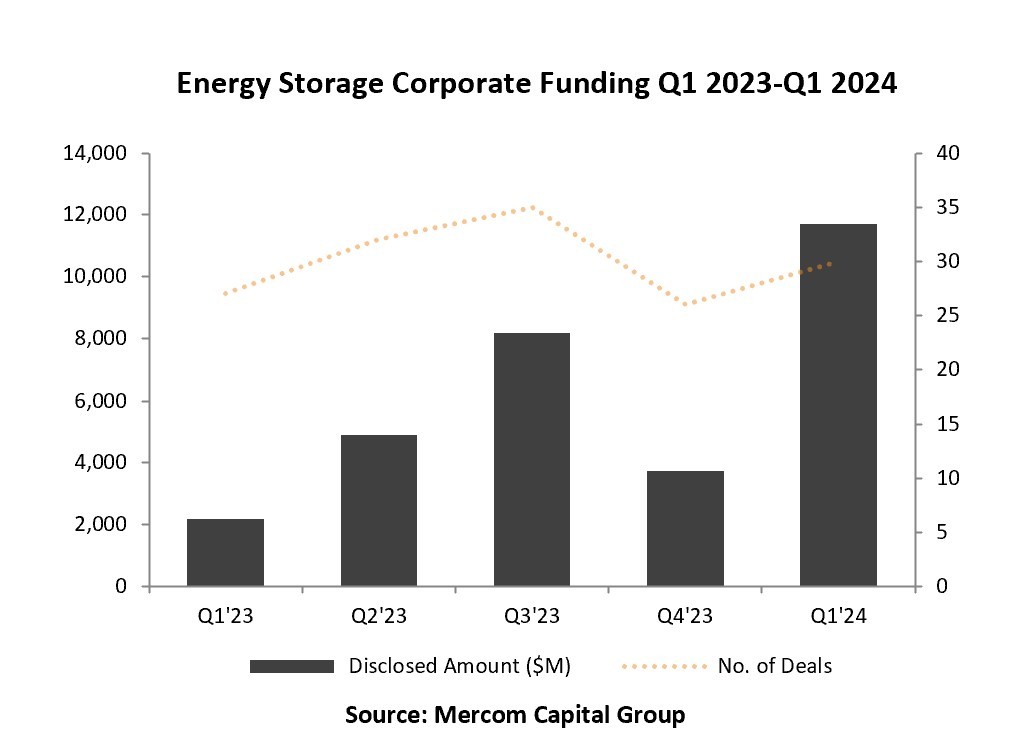 2024年第一季度,储能行业的企业完成投资交易29笔,达到117亿美元,同比增长432%。与2023年第四季度的37亿美元(26笔交易)相比增长了216%。
