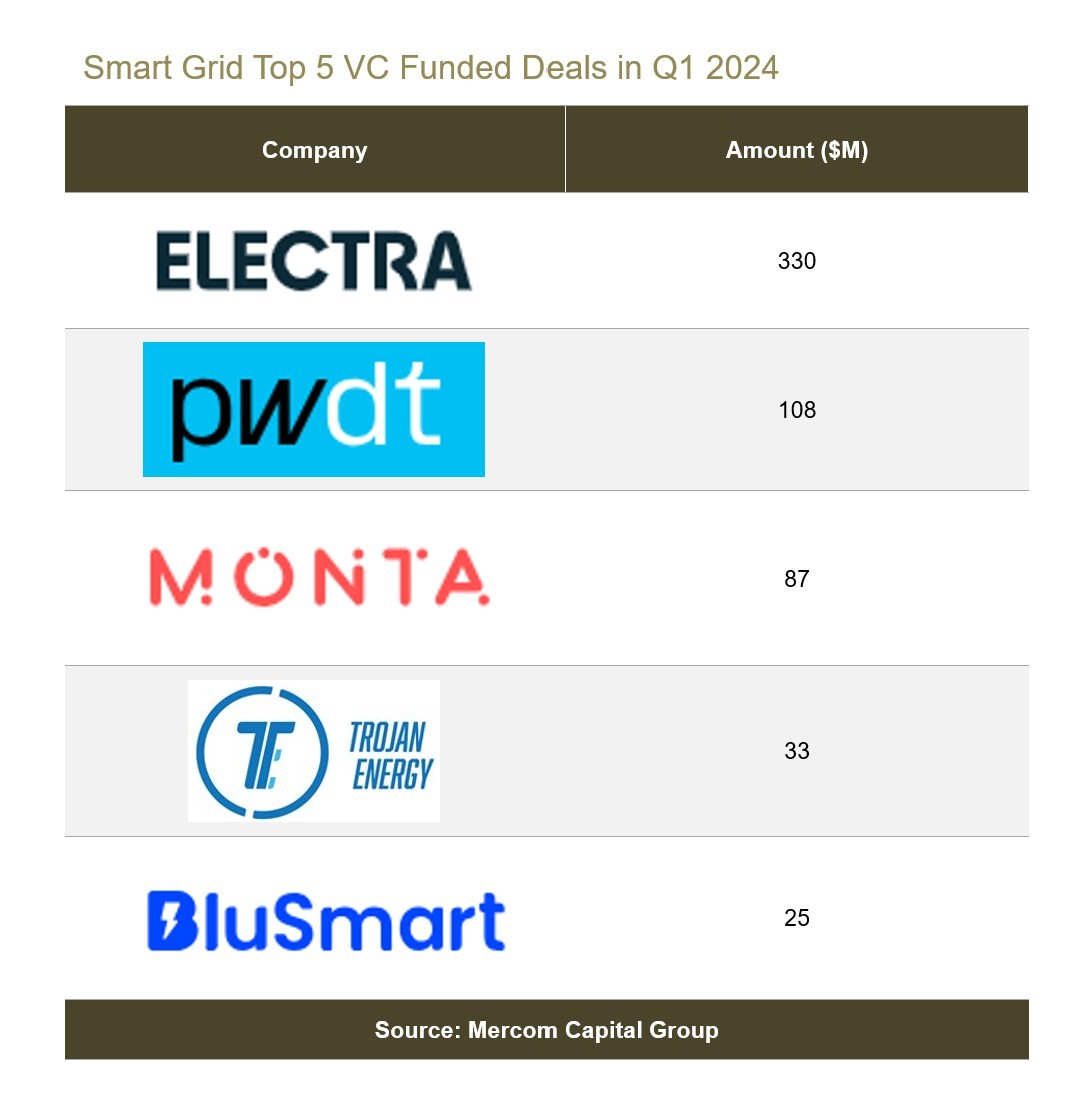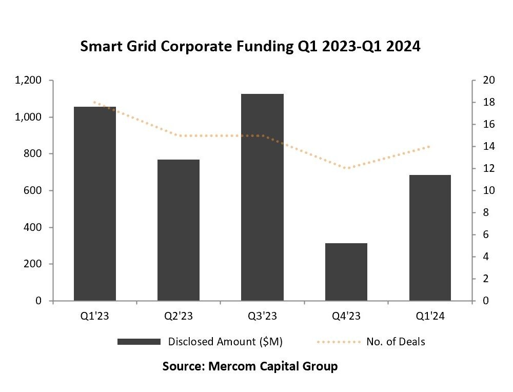 智能电网风险投资在2024年第一季度增长了134%,其中12笔交易获得了6.56亿美元;2023年第一季度完成14笔交易,获得了2.8亿美元。2024年第一季度投资额比2023年第四季度高出197%,当时共有10笔交易,获得了2.21亿美元投资。
