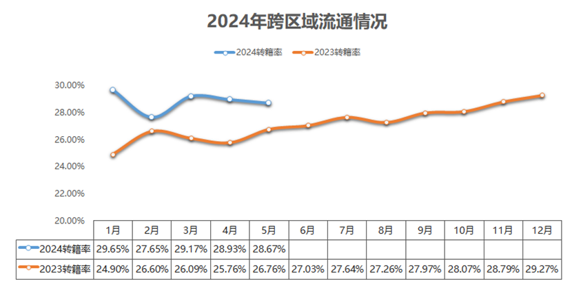3. 跨区域流通活跃:为了扩大市场覆盖率和缓解库存压力,二手车市场的跨区域流通持续活跃。5月份的外迁率达到28.8%,较同期增长了2%,显示出二手车市场在全国范围内的流通性和活跃度。