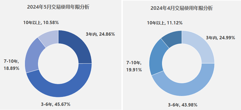 5月,二手车使用年限在3-6年的交易占比最多,占45.67%。环比增长1.69%,较去年同期增长3.04%;使用年限在3年内车型占24.86%,环比下降0.13%,较去年同期下降3.53%;车龄在7-10年的车型占18.89%,环比下降1.02%,较去年同期下降2.22%;车龄10年以上的车型占比为10.58%,环比下降0.54%,较去年同期增长了2.70%。