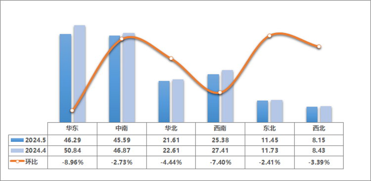 2024年5月,全国六大区环比上月均出现了不同程度的下降,其中华东、西南地区的降幅最为明显。