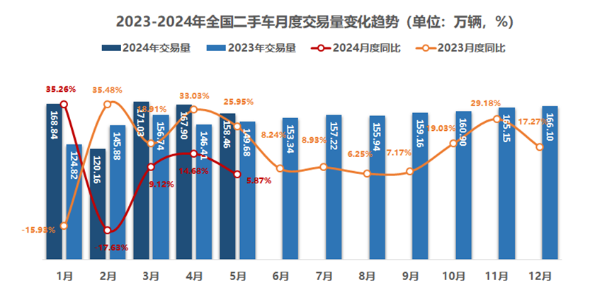 2024年5月,全国二手车市场交易量158.46万辆,环比下降5.62%,同比增长5.87%,交易金额为1023.31亿元。