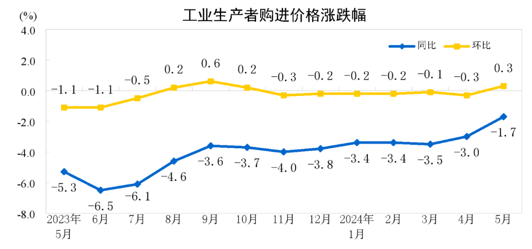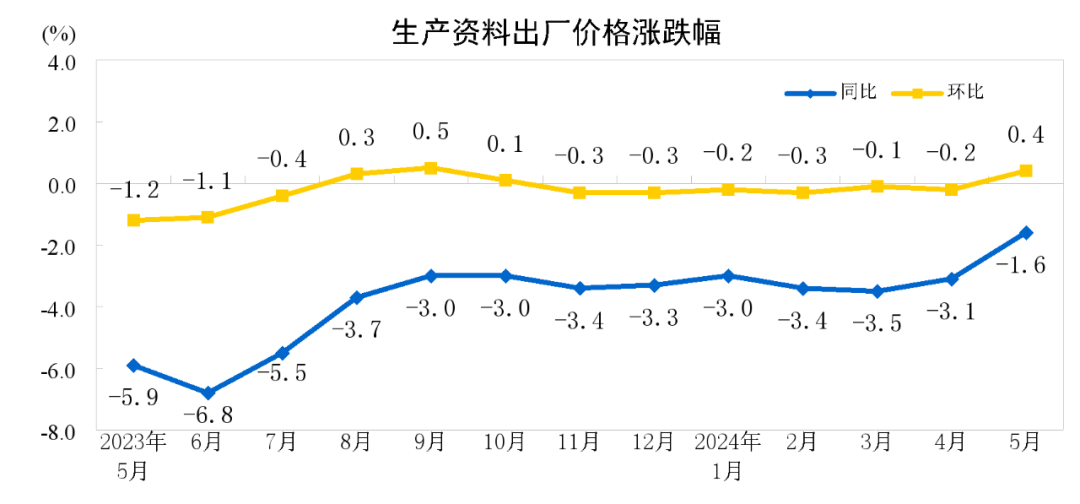 2024 年 5 月份,全国工业生产者出厂价格同比下降 1.4%,降幅比上月收窄 1.1 个百分点,环比上涨 0.2%,上月为下降 0.2%;工业生产者购进价格同比下降 1.7%,环比上涨 0.3%。1—5 月平均,工业生产者出厂价格比上年同期下降 2.4%,工业生产者购进价格下降 3.0%。
