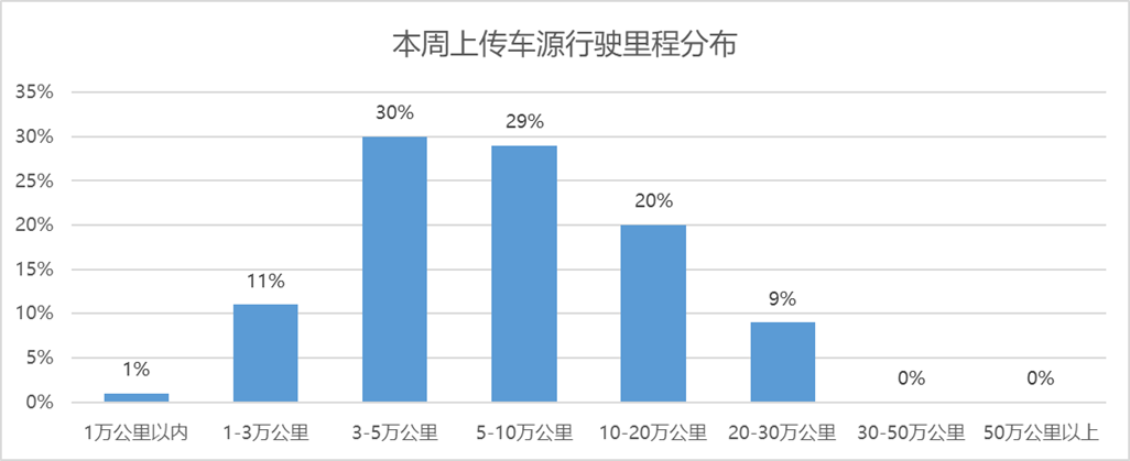 从上传车源行驶里程数据来看,本周上传数据中,1-3万公里的“准新车”数据增加1%,3-5万公里以内的“较新车”数据增长了1%,5-10万公里的“性价比”车源数据与上周保持一致,10万公里以上的“老旧车”数据较上周减少2%。