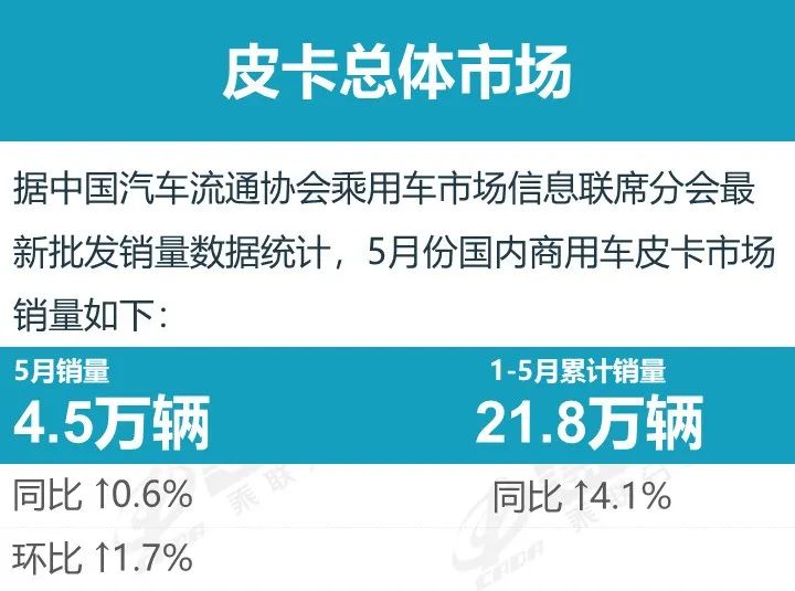 2024 年 5 月份皮卡市场销售 4.5 万辆,同比持平,环比增长 1.7%,处于近 5 年的中高位水平。由于去年 5 月皮卡基数相对稍高,因此 5 月的成绩还算不错。今年 1-5 月的皮卡销量 21.8 万辆,实现同比增长 4.1%,总体表现不错。