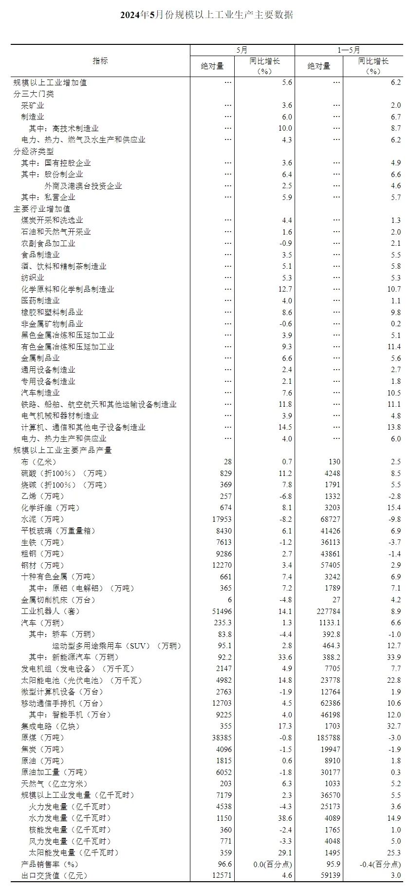 分三大门类看,5月份,采矿业增加值同比增长3.6%,制造业增长6.0%,电力、热力、燃气及水生产和供应业增长4.3%。
