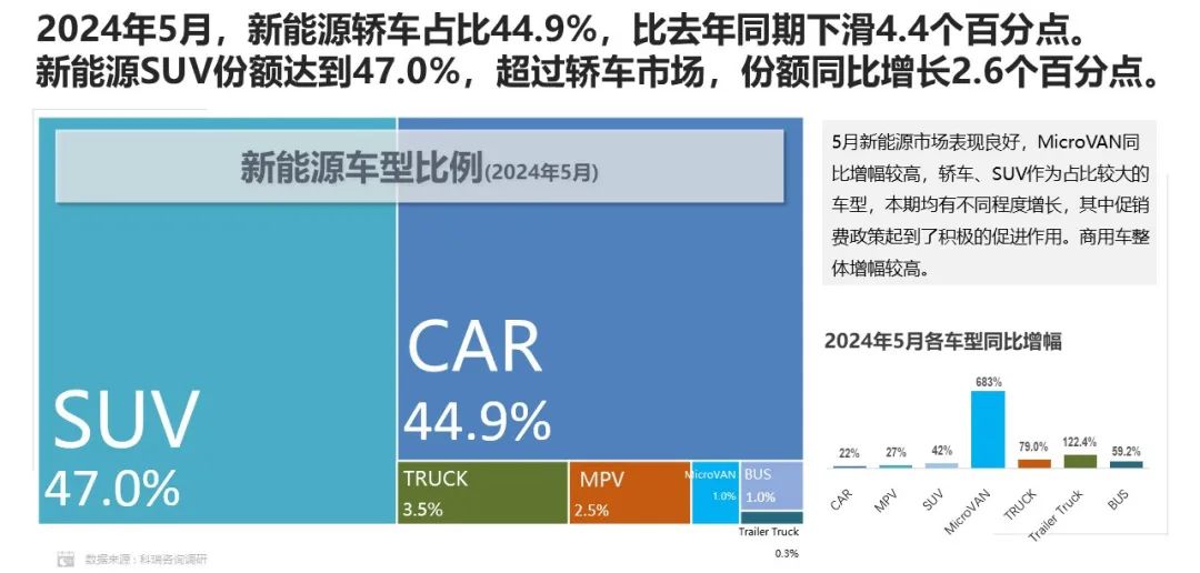 - 2024年5月,新能源轿车占比44.9%,比去年同期下滑4.4个百分点。新能源SUV份额达到47.0%,超过轿车市场,份额同比增长2.6个百分点。5月新能源市场表现良好,MicroVAN同比增幅较高,轿车、SUV作为占比较大的车型,本期均有不同程度增长,其中促销费政策起到了积极的促进作用。商用车整体增幅较高。