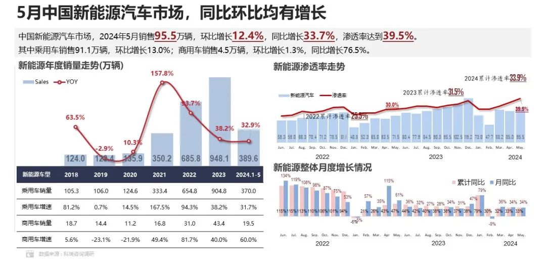 中国新能源汽车市场,2024年5月销售95.5万辆,环比增长12.4%,同比增长33.7%,渗透率达到39.5%。其中乘用车销售91.1万辆,环比增长13.0%。 -
