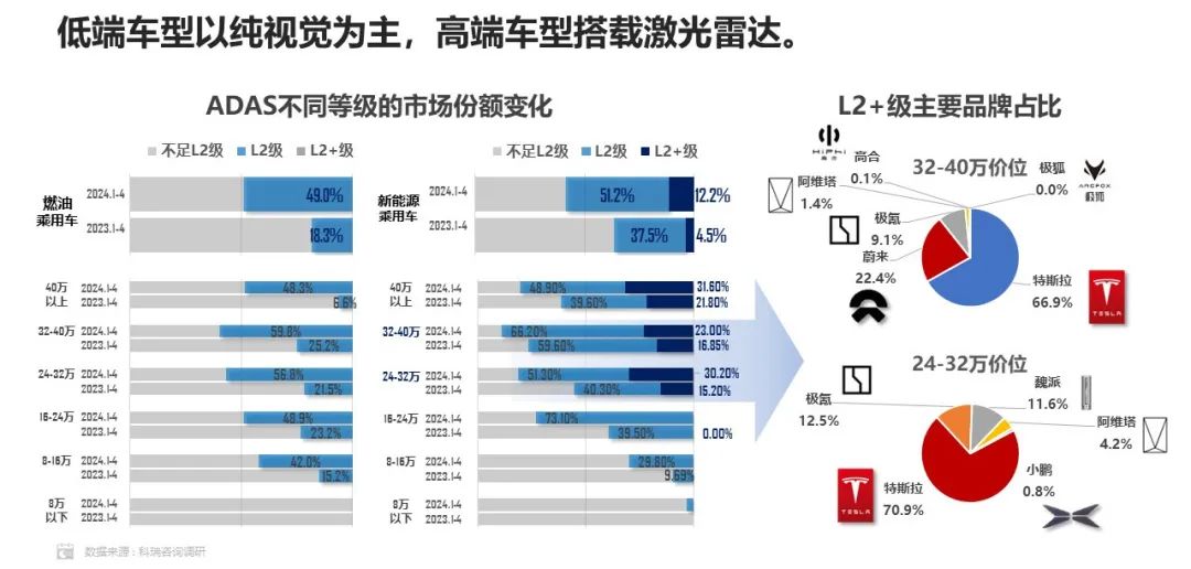 2024年1-4月新能源乘用车L2级及以上的辅助驾驶功能装车率达到63.4%,L2+占比小幅提高,高价车型装车率表现好于低价车型,目前低端车型以纯视觉为主,高端车型搭载激光雷达。L3级自动驾驶也在加速推进,随着技术逐渐成熟,成本会随之下降,进而带动辅助驾驶功能装车率增长。