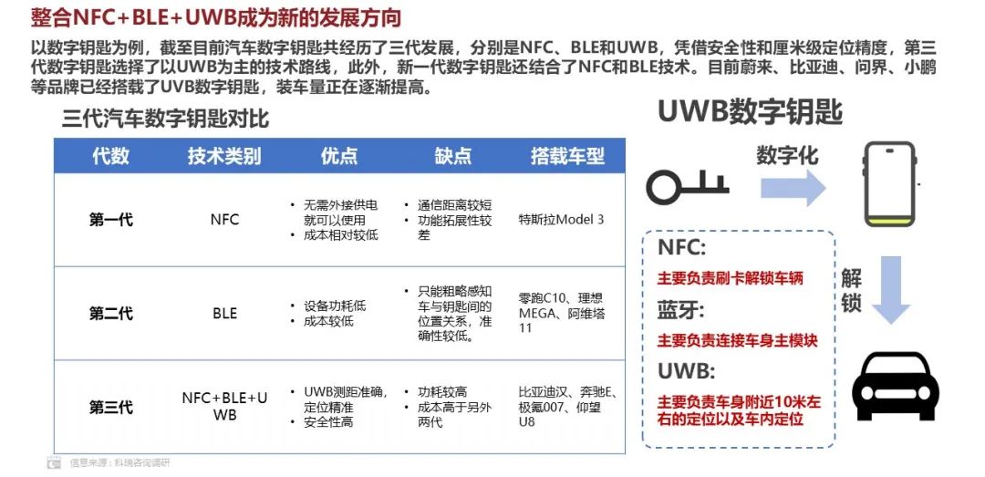 以数字钥匙为例,截至目前汽车数字钥匙共经历了三代发展,分别是NFC、BLE和UWB,凭借安全性和厘米级定位精度,第三代数字钥匙选择了以UWB为主的技术路线,此外,新一代数字钥匙还结合了NFC和BLE技术。目前蔚来、比亚迪、问界、小鹏等品牌已经搭载了UVB数字钥匙,装车量正在逐渐提高。