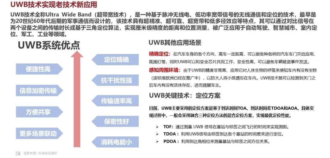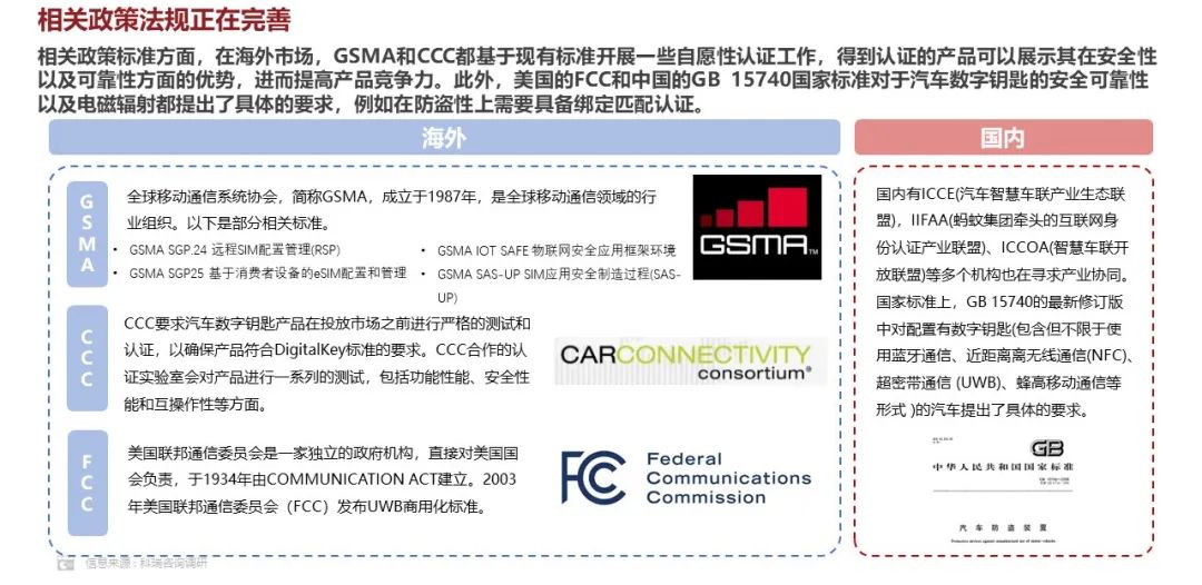 - 相关政策标准方面,在海外市场,GSMA和CCC都基于现有标准开展一些自愿性认证工作,得到认证的产品可以展示其在安全性以及可靠性方面的优势,进而提高产品竞争力。此外,美国的FCC和中国的GB 15740国家标准对于汽车数字钥匙的安全可靠性以及电磁辐射都提出了具体的要求,例如在防盗性上需要具备绑定匹配认证。随着高通、NXP等上游芯片方案商不断推陈出新,汽车UWB赛道的关注度正在不断提高。此外国产UWB芯片的异军突起,进一步降低了零部件成本。政策稳步推进加之产品逐渐完善,将帮助UWB数字钥匙进一步扩大装车率。