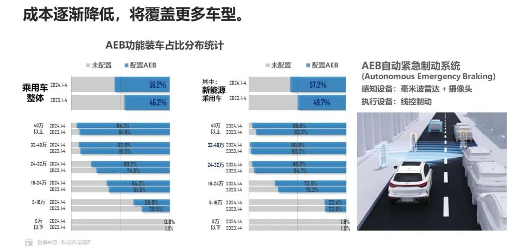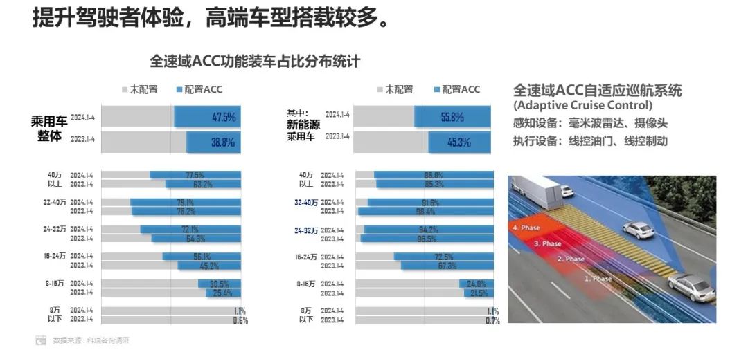 全速域ACC自适应巡航是ADAS中的一项核心功能,通过雷达或激光雷达来监测前车的距离和速度,自动调整车速以保持安全距离。低价车型中装车率较低,该功能多在高端车型中,或以选装形式存在。24万元以上新能源乘用车装车率表现良好,占比超过80%。