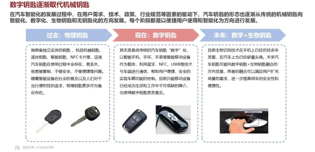 在汽车智能化的发展过程中,在用户需求、技术、政策、行业规范等因素的驱动下,汽车钥匙的形态也逐渐从传统的机械钥匙向智能化、数字化、生物钥匙和无钥匙化的方向发展。每个阶段都是以便捷用户使用和智能化为方向进行发展。