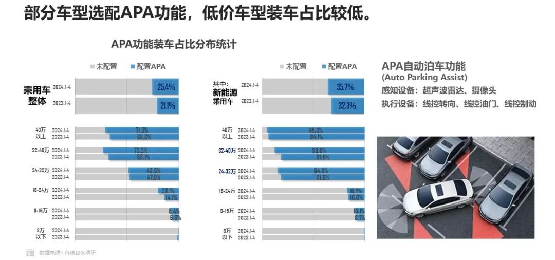 - 自动泊车系统简称APA。搭载有自动泊车功能的汽车可以不需要人工干预,通过车载传感器、处理器和控制系统的帮助就可以实现自动识别车位,并自动完成泊车入位的过程。目前新能源乘用车装配率超过35%,分价位区间来看,目前32万以上乘用车装配率超过70%,24万以上新能源乘用车装车率超过80%,部分车型选配APA功能,在低价车型上目前装车占比仍然较低。