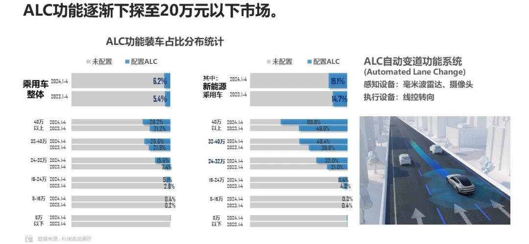 ALC自动变道功能是一项基于车道居中辅助扩展的舒适性的辅助驾驶功能。在通畅的封闭高速公路或城市快速路上,可以按照驾驶员的变道指令,辅助驾驶员进行车道变换。目前整体装车率仍较低,新能源装车率尚未到达20%,高端新能源车型装车率表现较好,随着成本的降低,ALC功能也逐渐下探至20万元以下市场,未来将有更多车型搭载该功能。