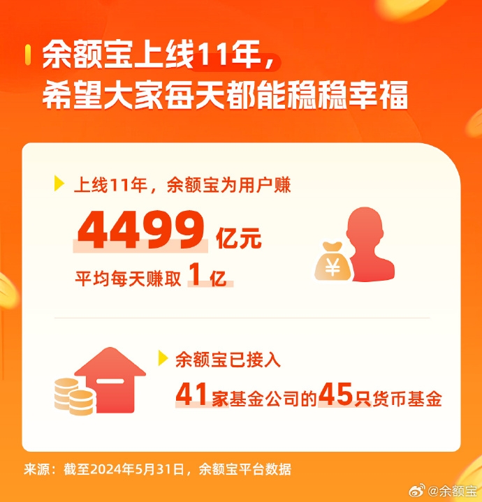 余额宝庆祝其成立11周年,官方数据显示,在过去11年间,余额宝已为用户累计赚取了4499亿元的收益。