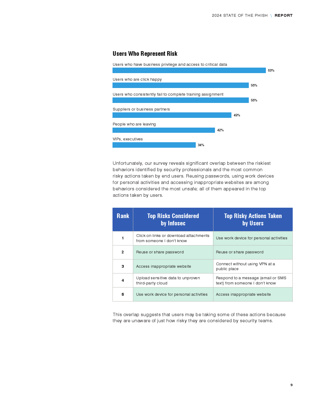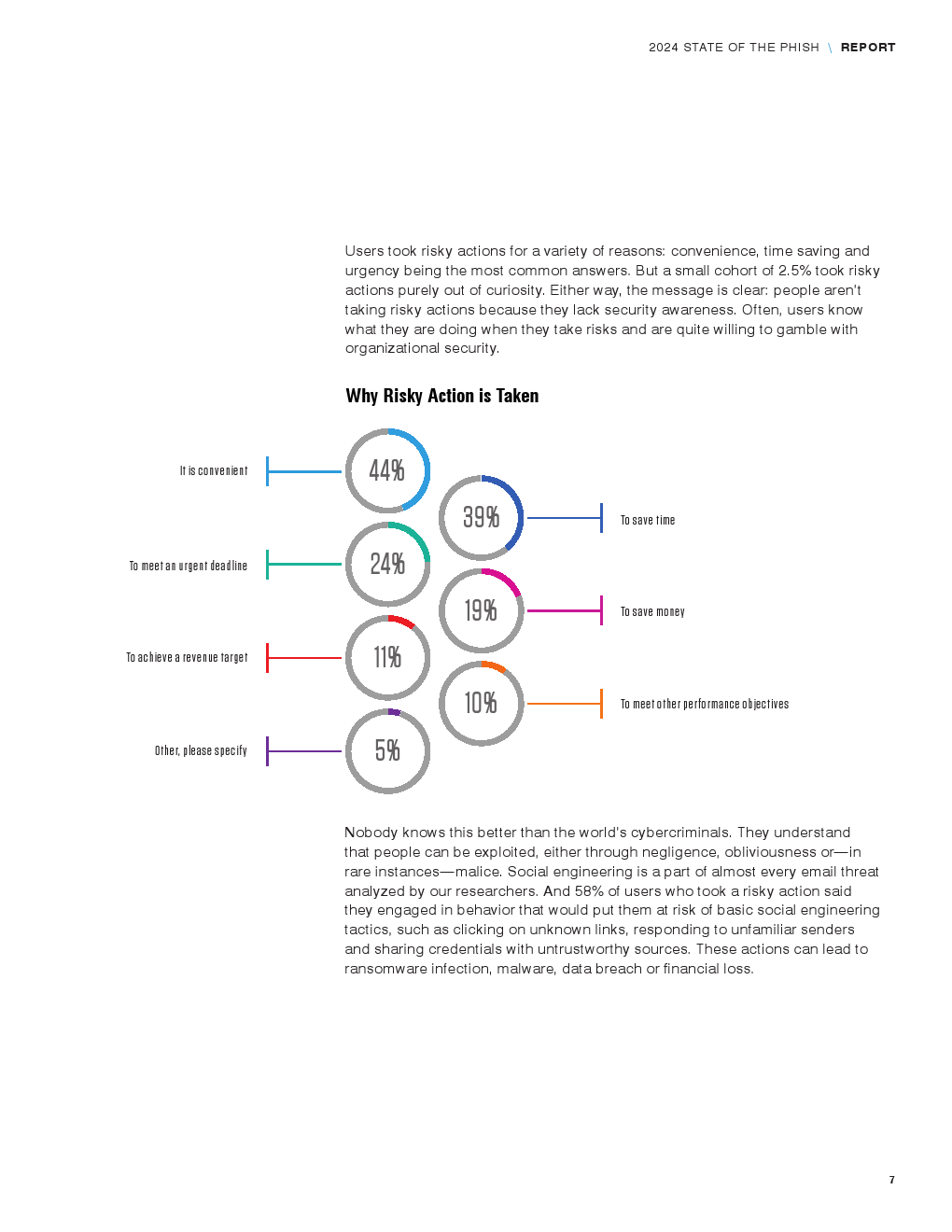 用户采取冒险行动的原因有很多:方便、省时和紧急是最常见的答案。但也有2.5%的人纯粹出于好奇而采取冒险行动。无论哪种方式,信息都很清楚:人们不采取冒险行动是因为他们缺乏安全意识。通常情况下,用户知道他们在做什么,当他们承担风险时,他们非常愿意拿组织的安全来赌一把。
