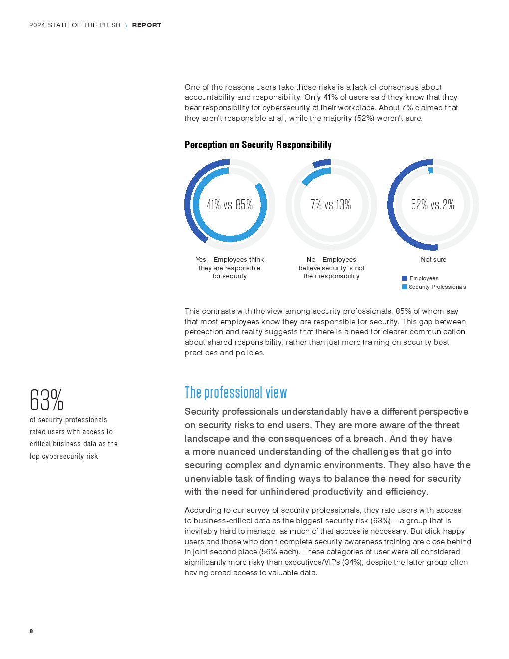 85%的安全专家表示,大多数员工知道他们对安全负责,但是,59%的用户要么不确定,要么声称他们根本不负责。