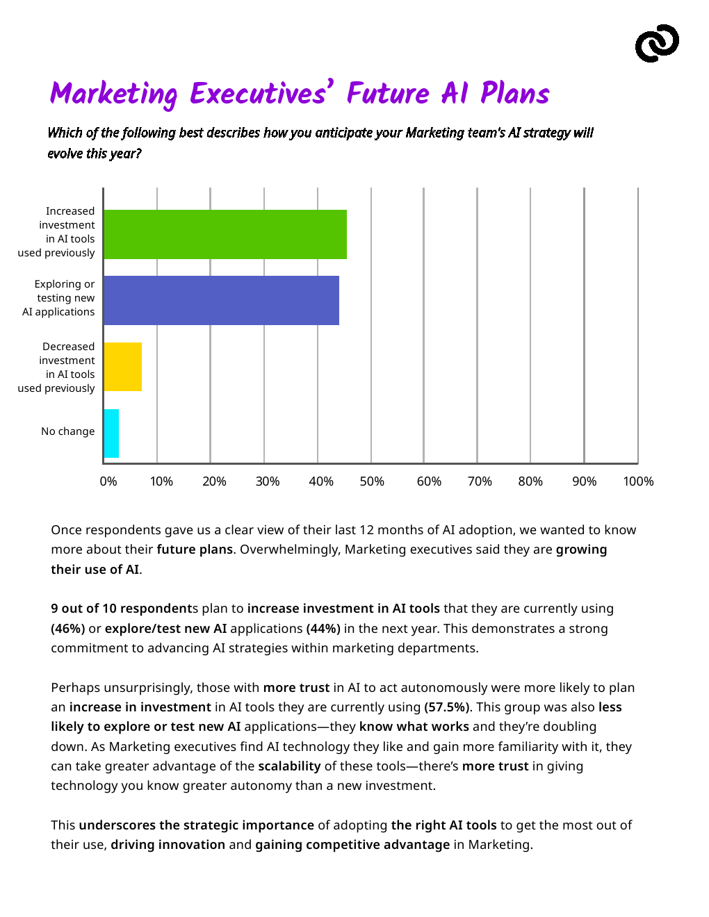 9/10的受访者计划在明年增加对他们目前使用的人工智能工具的投资(46%),或探索/测试新的人工智能应用(44%)。