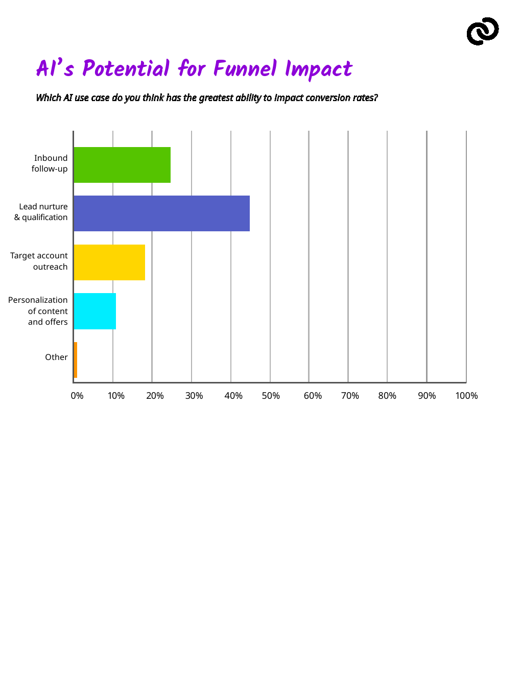 具体来看,他们认为在四个特定的人工智能用例中,哪一个最有能力影响转化率,多数(45%)的受访者表示,潜在客户培养和资格认证是人工智能产生最大影响的方面。