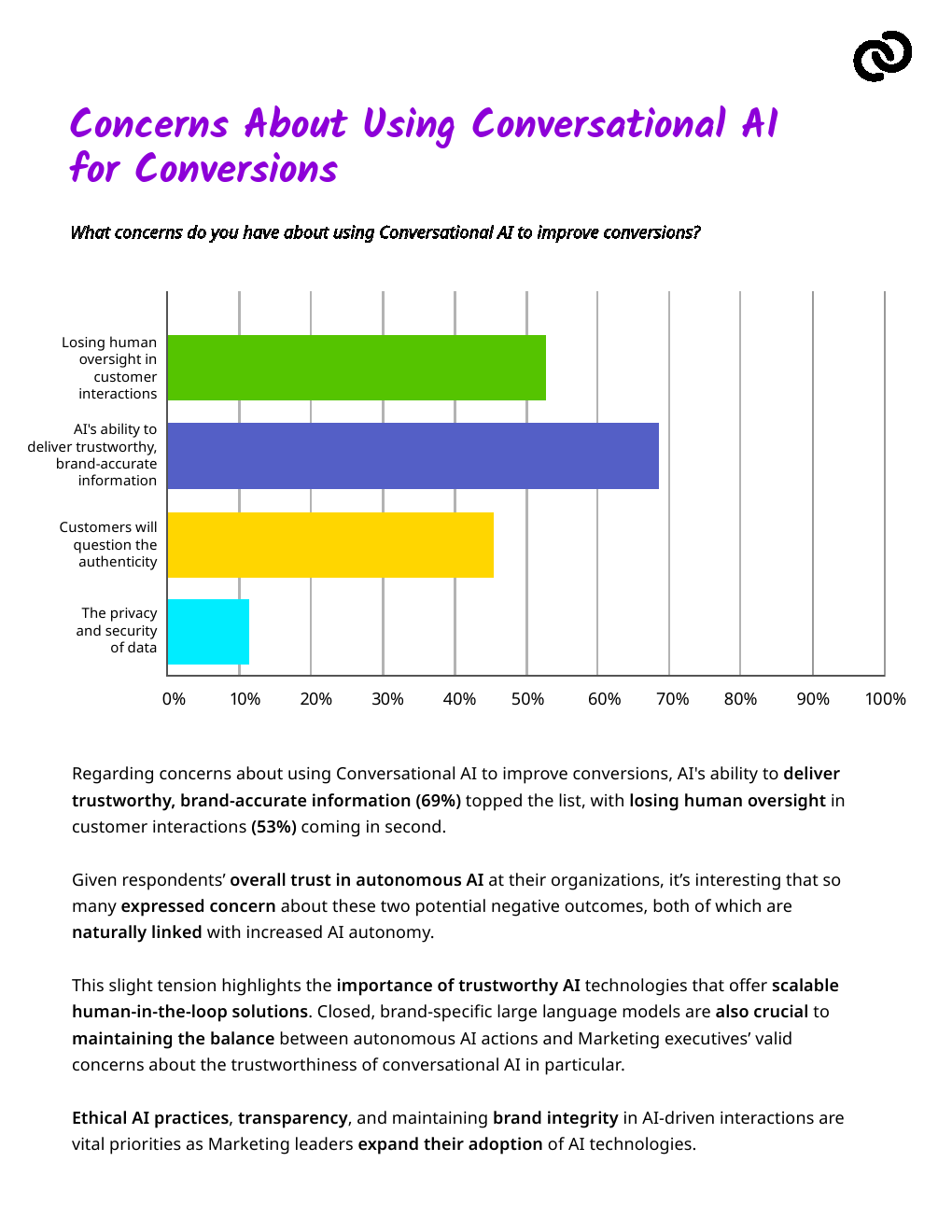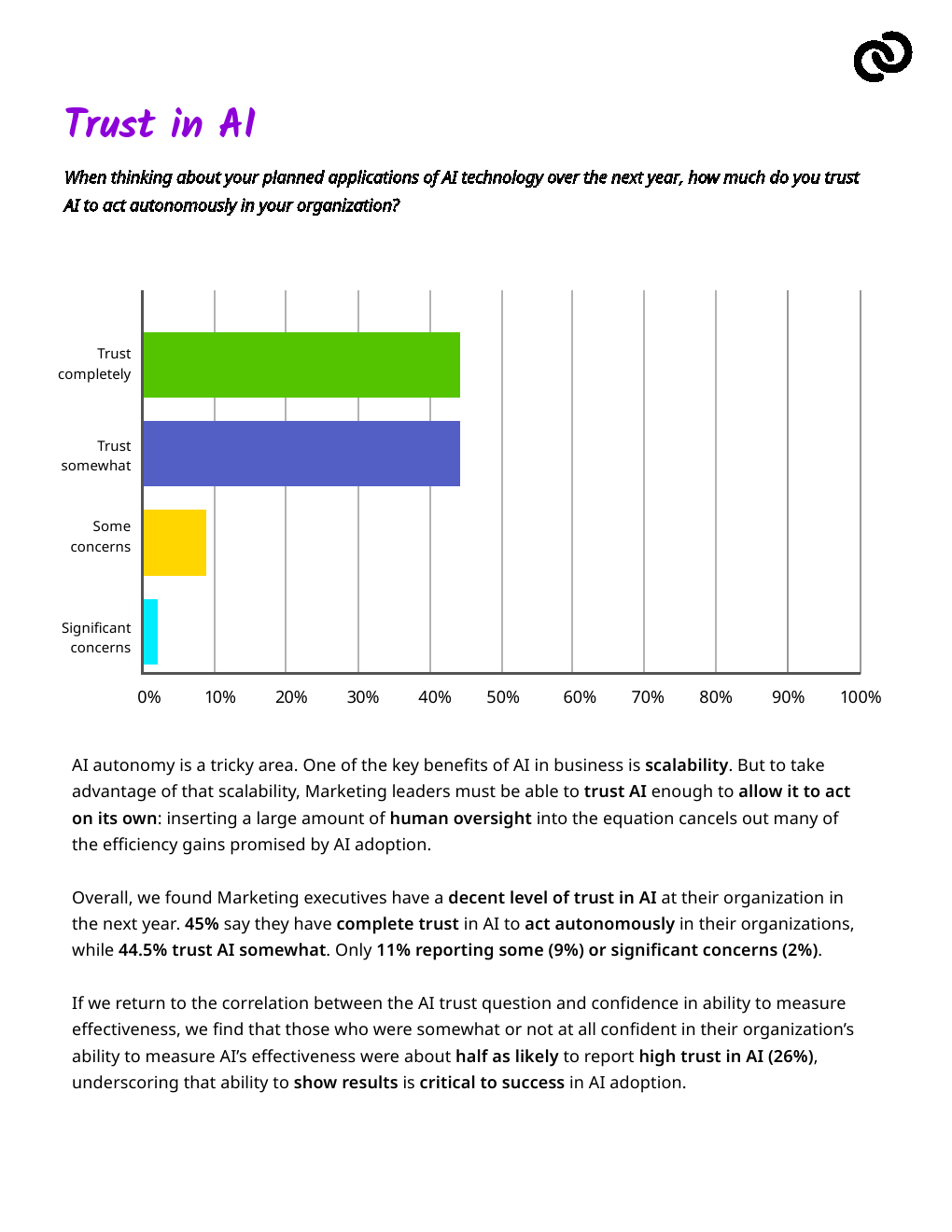 45%的受访者完全相信人工智能在他们的组织中能够自主行动,尽管另有45%的受访者在一定程度上相信他们的技术能够做到这一点。