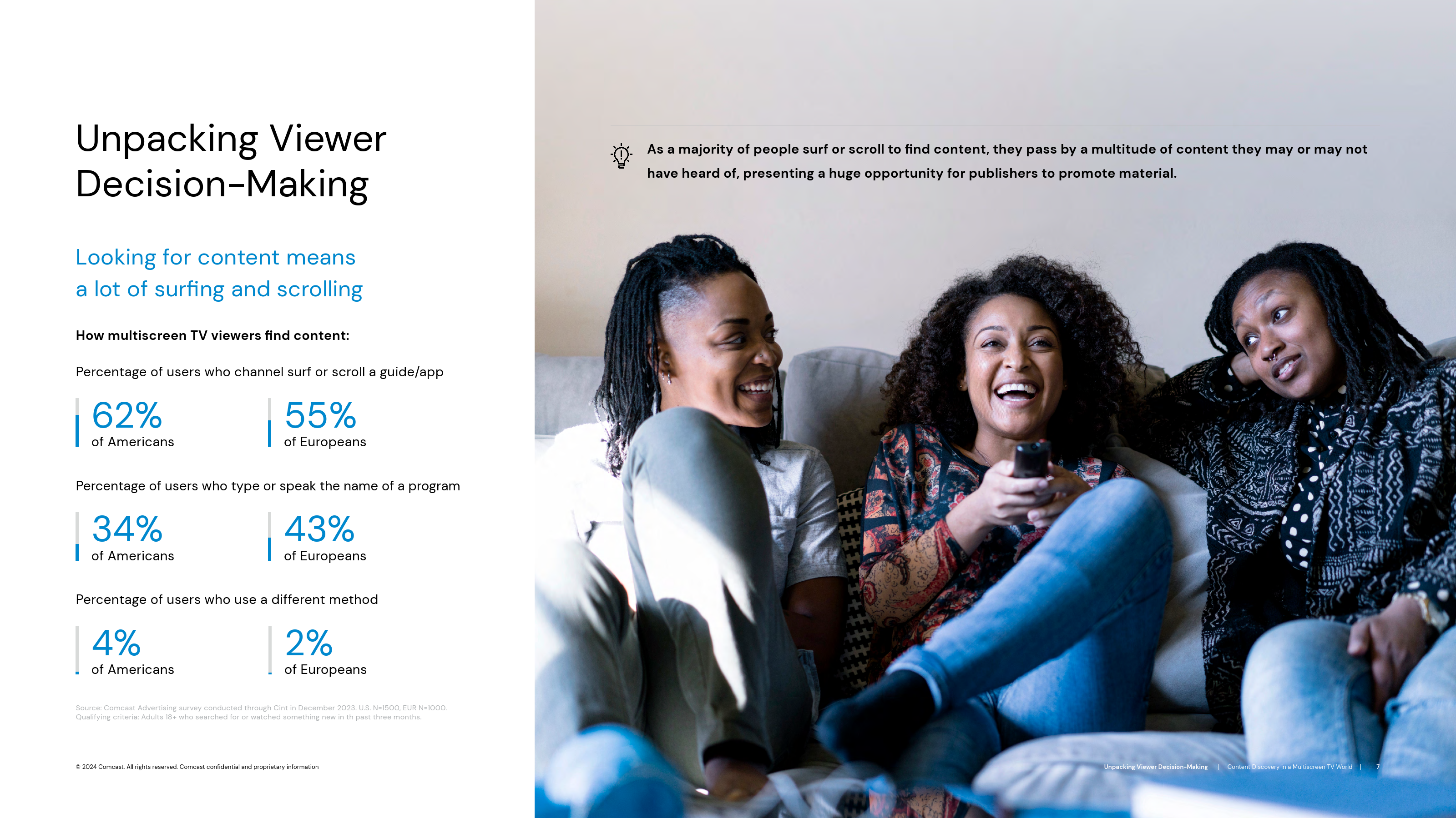 这种沮丧与之前的研究一致,即消费者使用视频服务的最大痛点是难以找到可观看的内容。事实上,在最近的一项调查中,近3/4的受访者认为,要想了解现有的节目以及在哪里观看这些节目太难了。