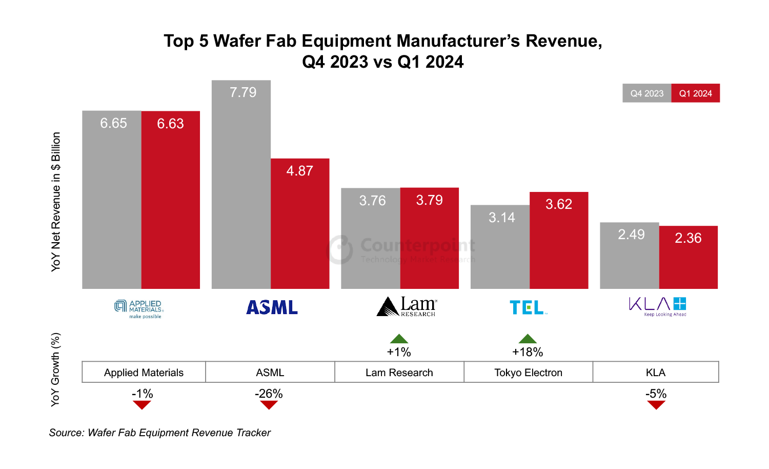 全球前五大晶圆设备(WFE)制造商的收入在2024年第一季度同比下降9%,原因是客户对尖端半导体的投资延迟,这在一定程度上被强劲的DRAM需求所抵消。其中,阿斯麦(ASML)和东京电子的收入分别同比下降21%和14%。