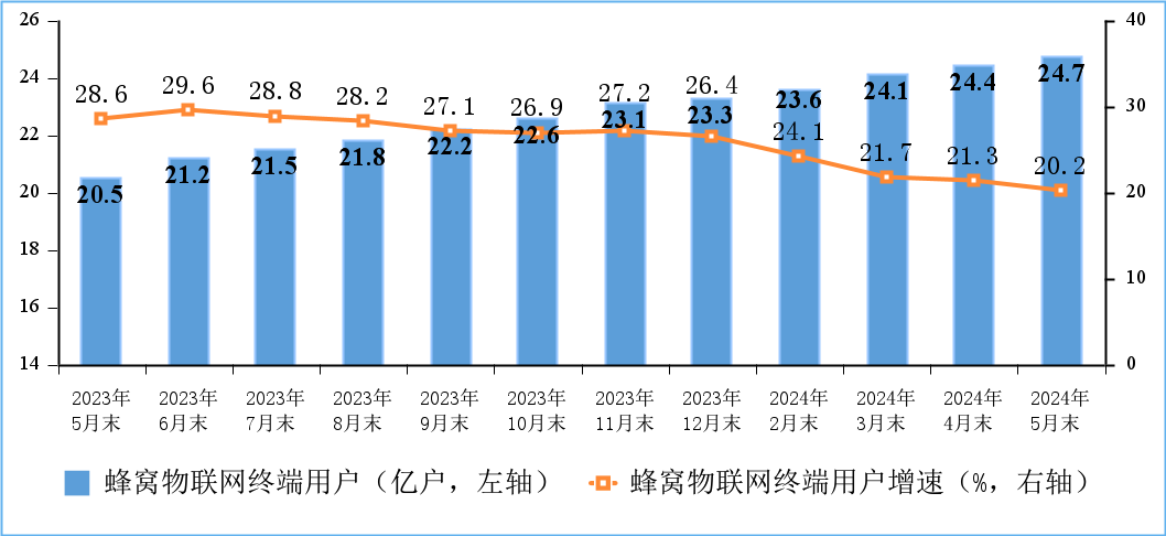 蜂窝物联网用户规模快速扩张,IPTV(网络电视)用户稳步增加。截至 5 月末,三家基础电信企业发展蜂窝物联网终端用户 24.65 亿户,比上年末净增 1.33 亿户,占移动网终端连接数(包括移动电话用户和蜂窝物联网终端用户)的比重达 58.3%。IPTV(网络电视)总用户数达 4.04 亿户,比上年末净增 259 万户。
