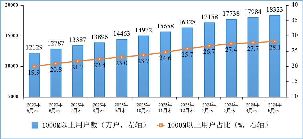 固定宽带接入用户规模稳步增加,千兆用户数持续扩大。截至 5 月末,三家基础电信企业的固定互联网宽带接入用户总数达 6.52 亿户,比上年末净增 1534 万户。其中,100Mbps 及以上接入速率的固定互联网宽带接入用户达 6.17 亿户,占总用户数的 94.6%;1000Mbps 及以上接入速率的固定互联网宽带接入用户达 1.83 亿户,比上年末净增 1996 万户,占总用户数的 28.1%,占比较上年末提升 2.4 个百分点。在高速率用户持续增长拉动下,家庭户均接入带宽达 481Mbps / 户,同比增长 18.7%。