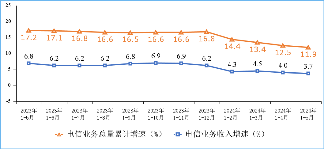 电信业务收入增速放缓,电信业务总量保持两位数增长。1—5 月份,电信业务收入累计完成 7387 亿元,同比增长 3.7%,增速较 1—4 月份回落 0.3 个百分点。按照上年不变价计算的电信业务总量同比增长 11.9%。
