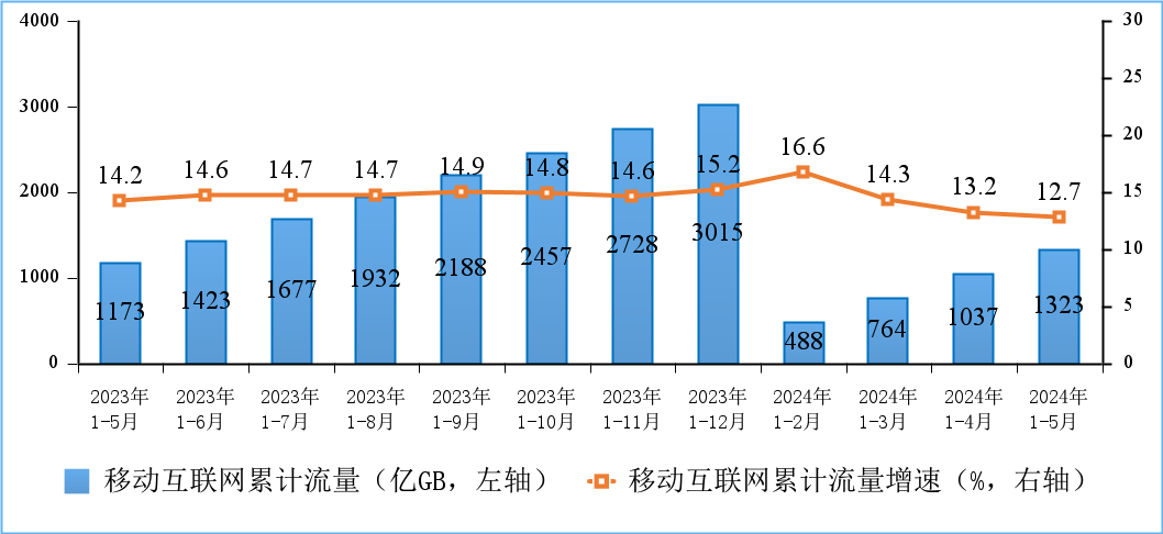 注:1. 自 2024 年 2 月起,将中国广播电视网络集团有限公司(简称中国广电)的 5G 移动电话用户数、5G 移动互联网接入流量、5G 移动互联网用户数纳入行业汇总数据,上年同期数据进行同步调整。