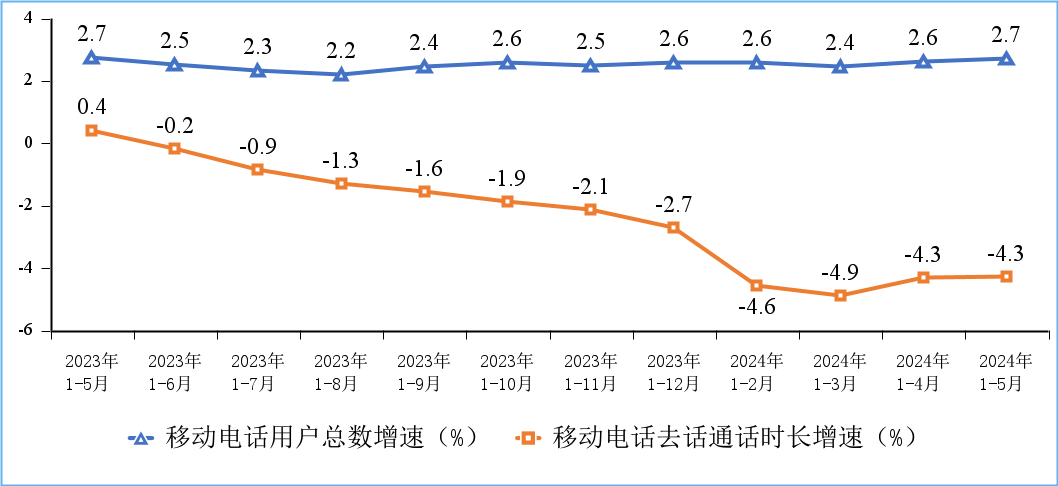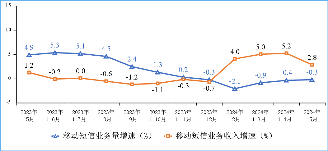 移动电话通话量和短信量小幅下降,移动短信业务收入保持增长。1—5 月份,移动电话去话通话时长完成 8916 亿分钟,同比下降 4.3%;固定电话主叫通话时长完成 314 亿分钟,同比下降 3.7%。1—5 月份,全国移动短信业务量同比下降 0.3%;移动短信业务收入同比增长 2.8%。