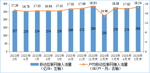 移动互联网流量较快增长,5 月 DOU 值处于高位。1—5 月份,移动互联网累计流量【见注 1】达 1323 亿 GB,同比增长 12.7%,增速较 1—4 月份回落 0.5 个百分点。截至 5 月末,移动互联网用户数【见注 1】达 15.45 亿户,比上年末净增 2078 万户。5 月当月户均移动互联网接入流量(DOU)达到 18.54GB / 户 · 月,同比增长 7.4%,比上年底低 0.39GB / 户 · 月。